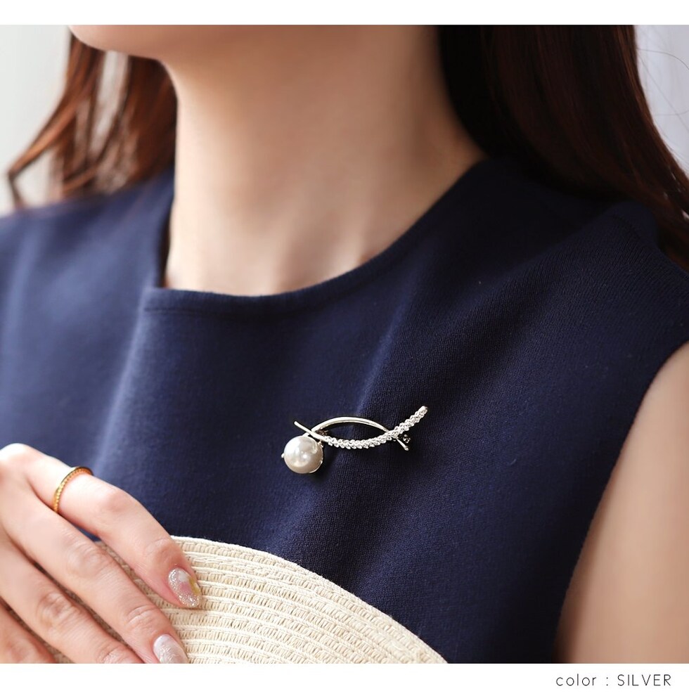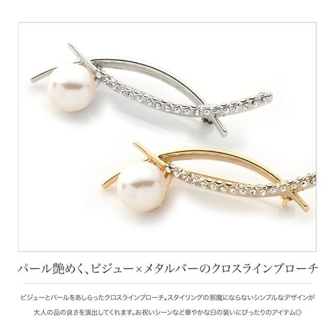 ビジューとパールをあしらったクロスラインブローチ。