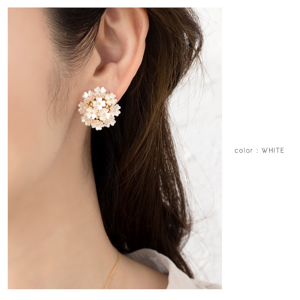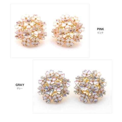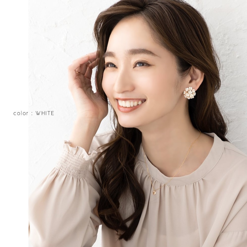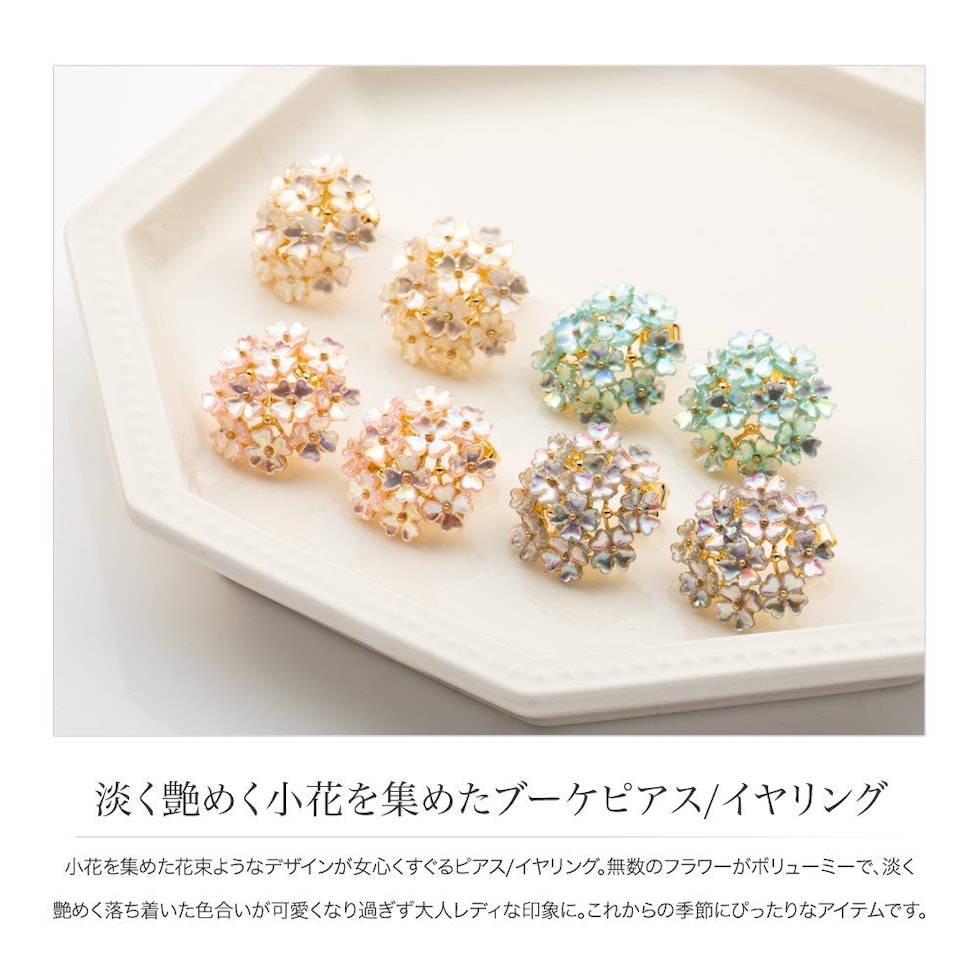 小花を集めた花束のようなデザインが女心くすぐるピアス/イヤリング。無数のフラワーがボリューミーで、淡く艶めく落ち着いた色合いが可愛くなり過ぎず大人レディな印象に。これからの季節にぴったりなアイテムです。
