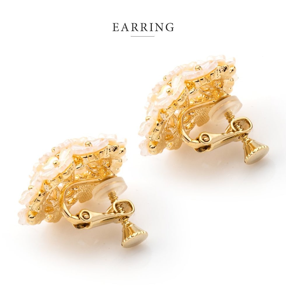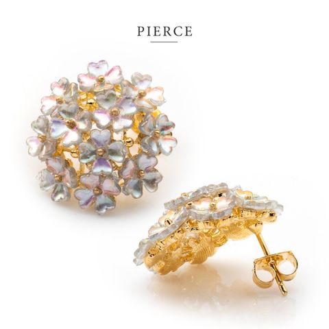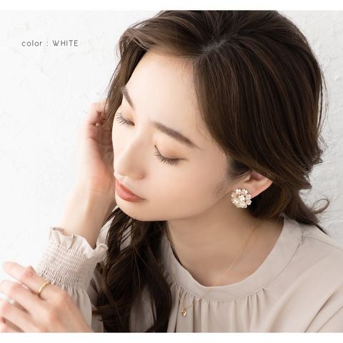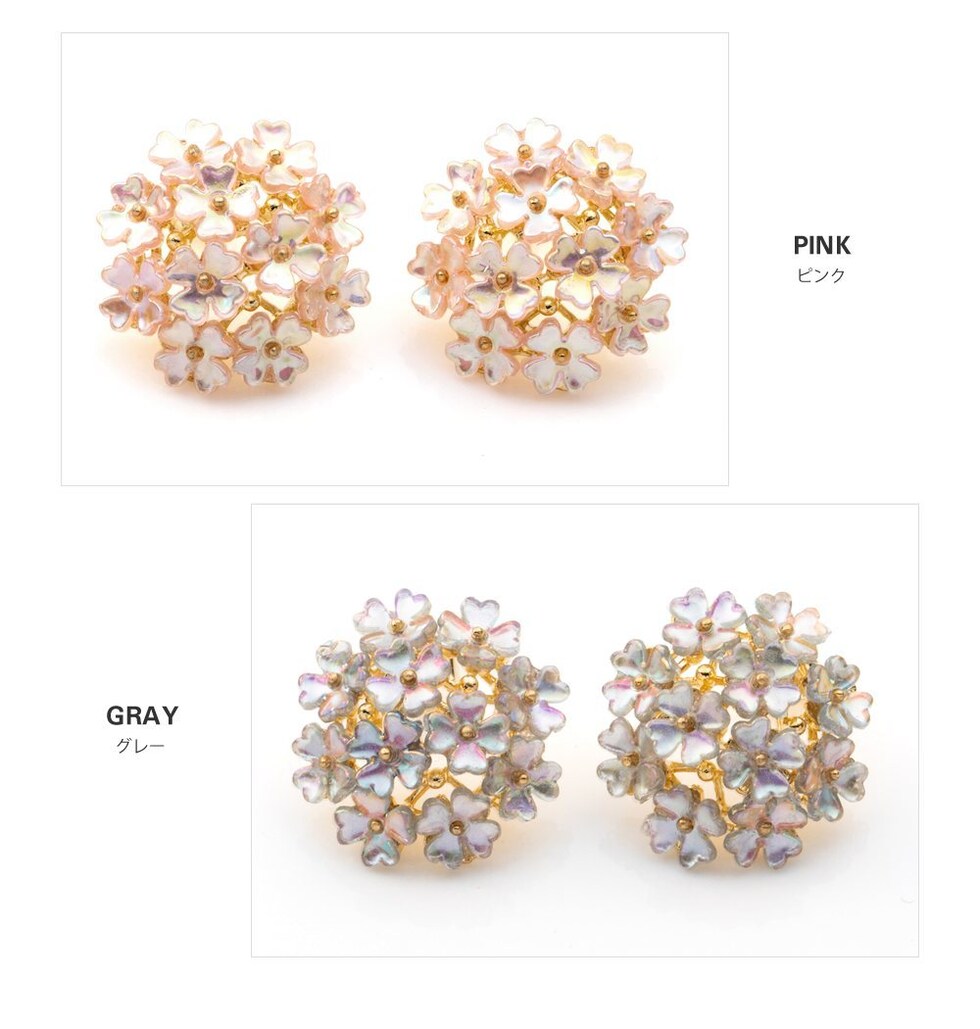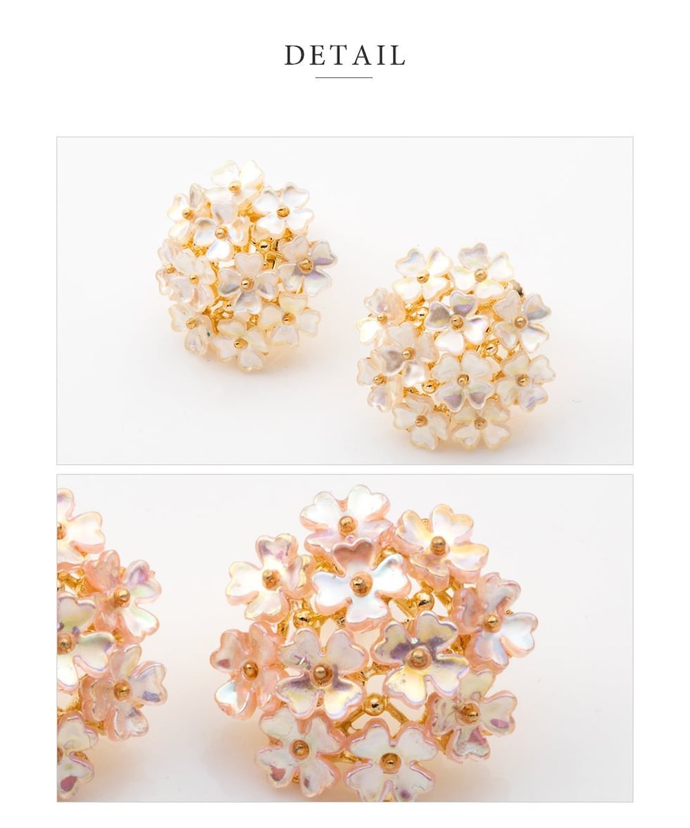 小花を集めた花束のようなデザインが女心くすぐるピアス/イヤリング。無数のフラワーがボリューミーで、淡く艶めく落ち着いた色合いが可愛くなり過ぎず大人レディな印象に。これからの季節にぴったりなアイテムです。