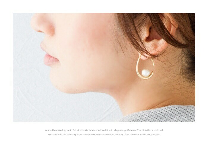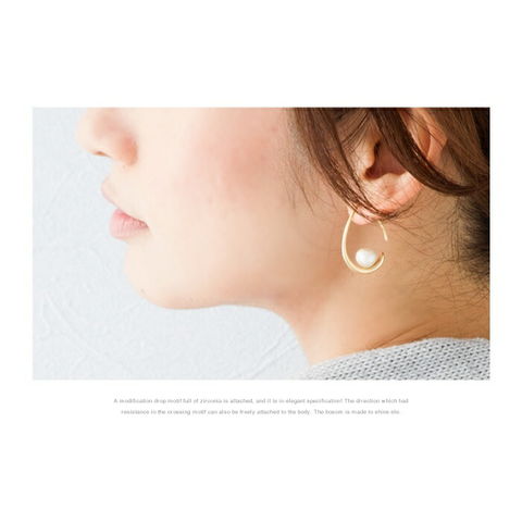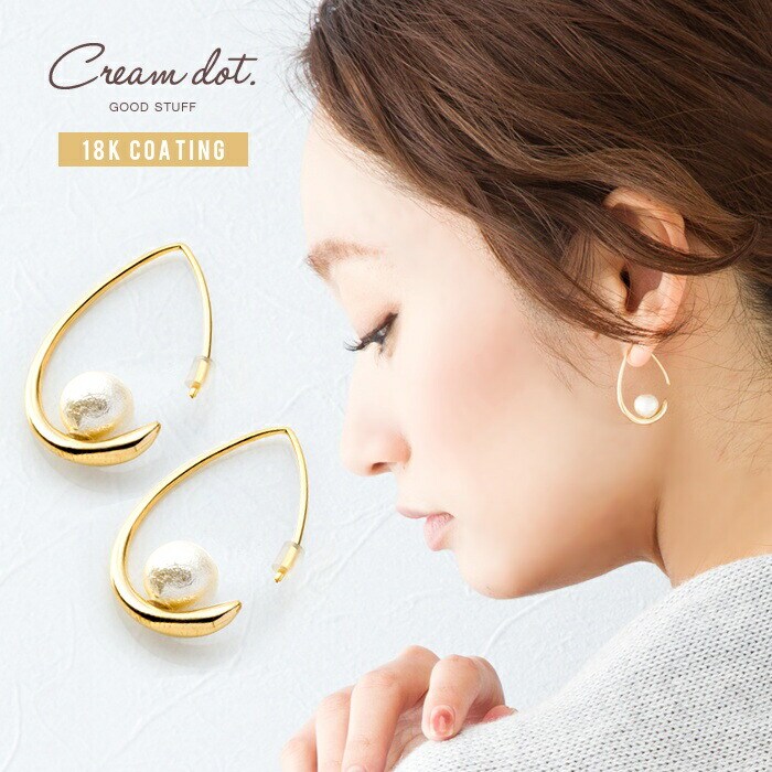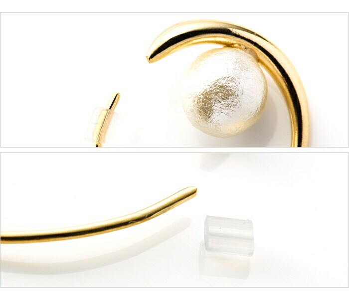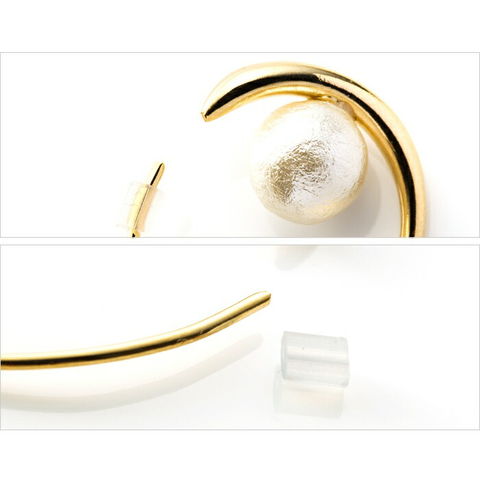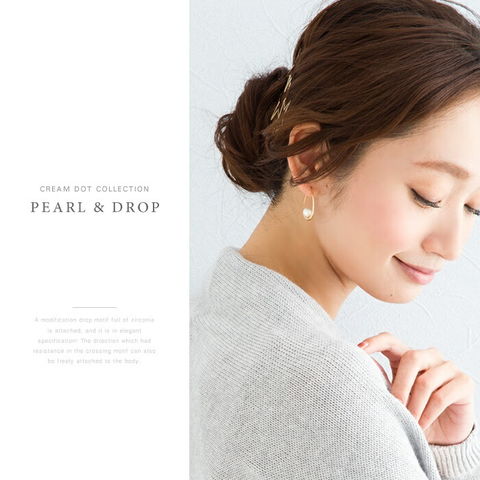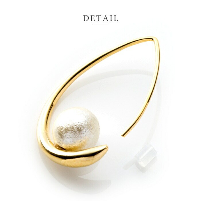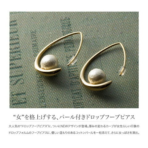 厚みの変わるカーブが女性らしい印象のドロップフォルムのフープピアスに、優しい温もりのあるコットンパールを一粒添えて、さらに女っぽさを演出。