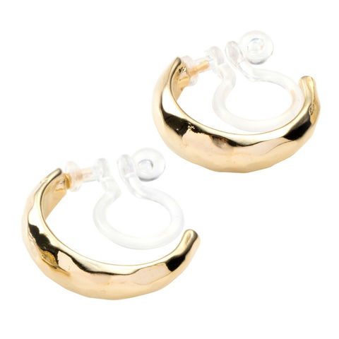 表面にたたき加工を施した小ぶりのフープイヤリング/ピアス。緩やかに幅の変わる丸みシェイプが女性らしい印象で、さりげなくお顔周りを大人華やかに演出。シンプルなフォルムだからオフィス使いにもおすすめ◎