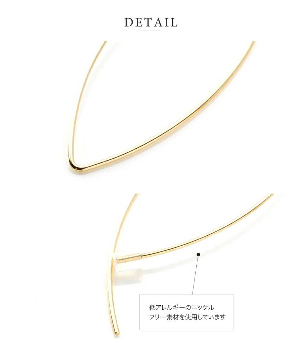 下から耳たぶに通して装着する、シンプルなメタルワイヤーのフック式ピアス。