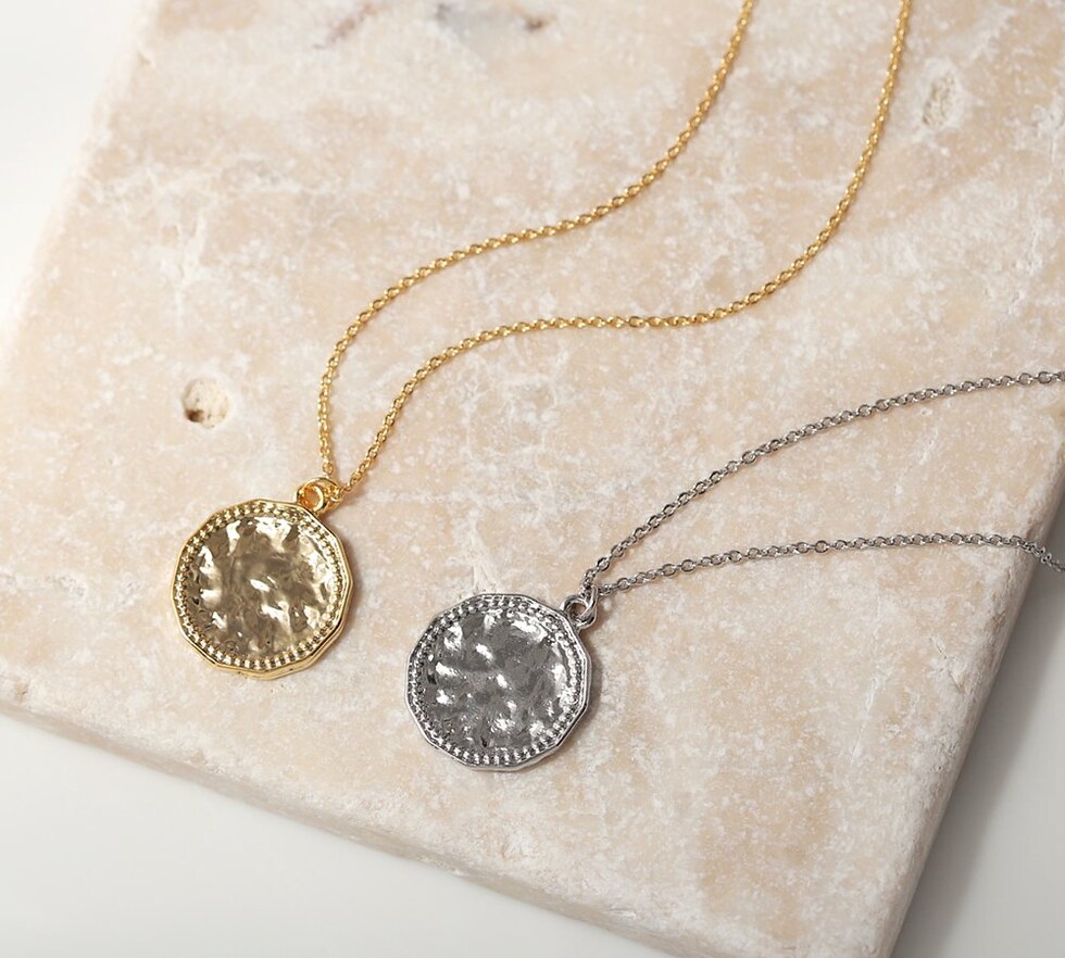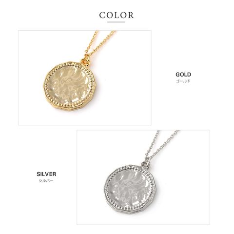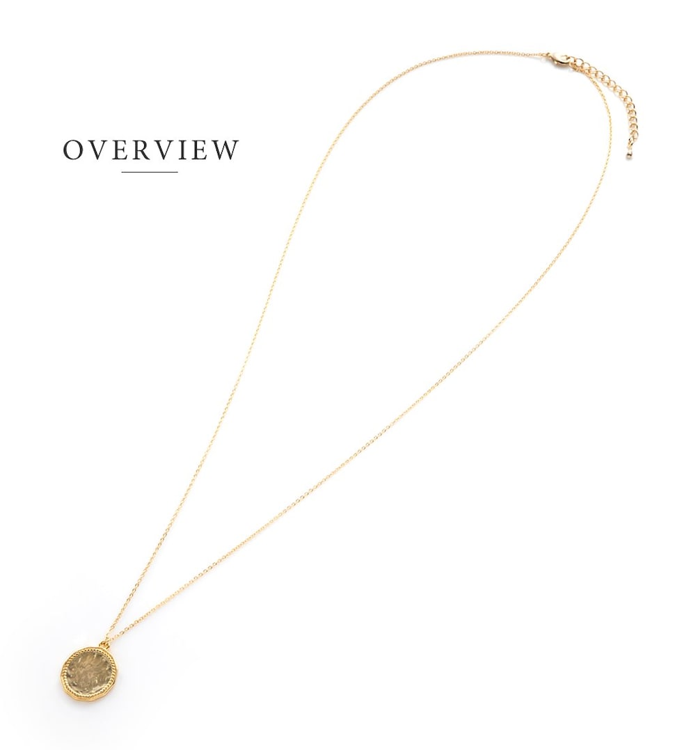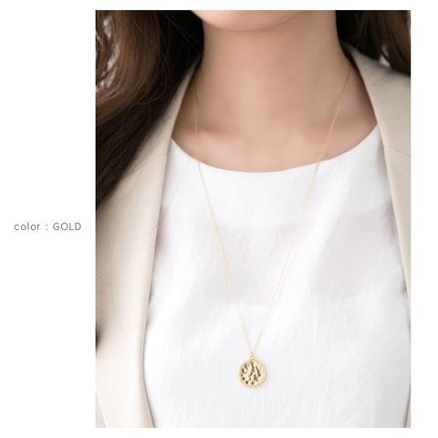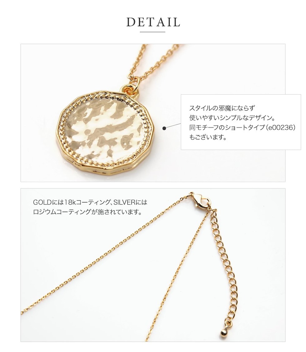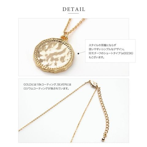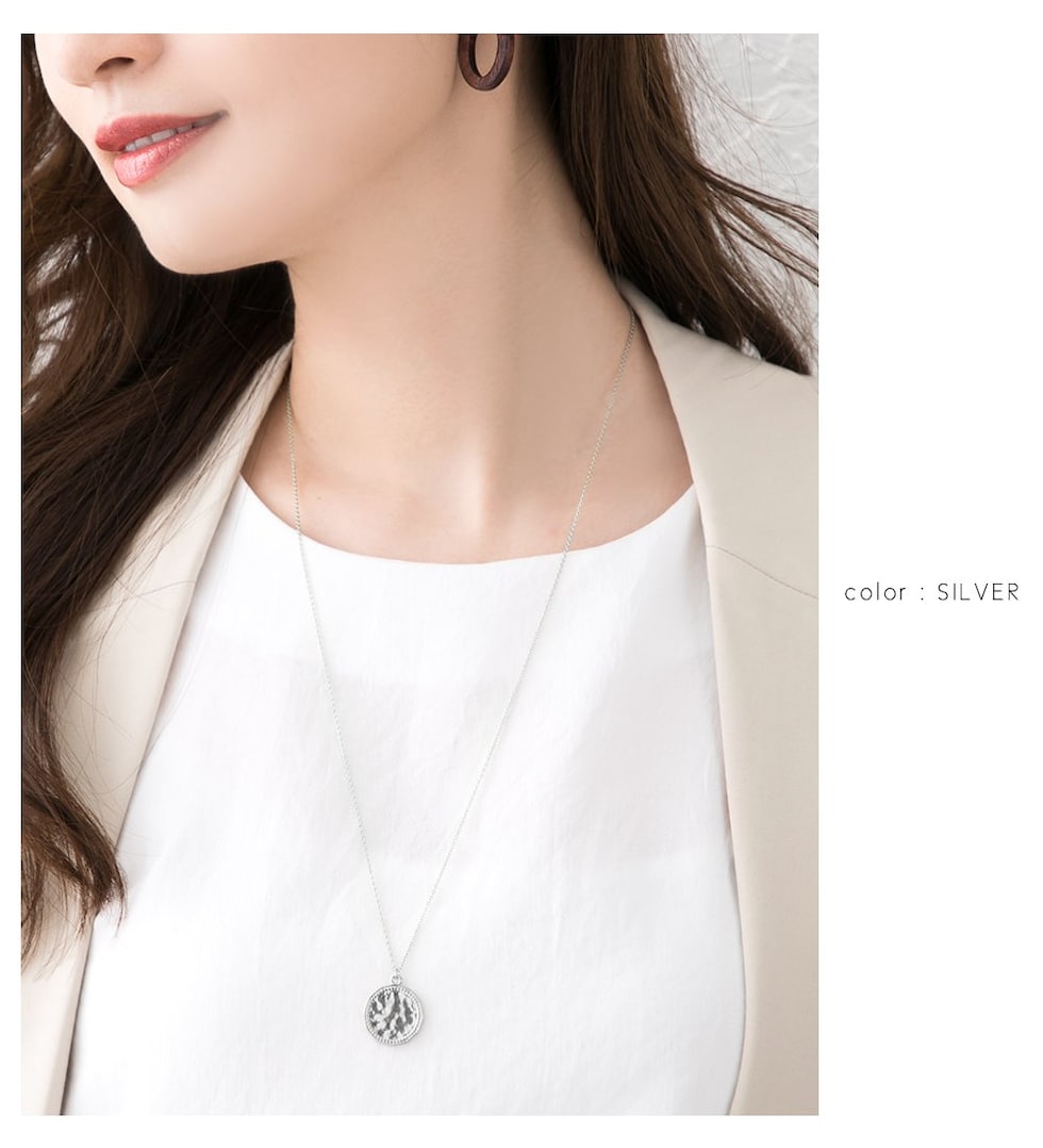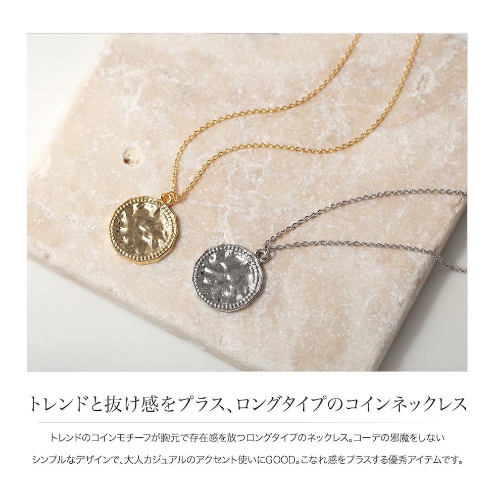 トレンドのコインモチーフが胸元で存在感を放つロングタイプのネックレス。