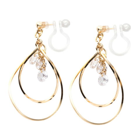 重なりドロップフレームと3連ビジューを組み合わせたピアス/イヤリング。