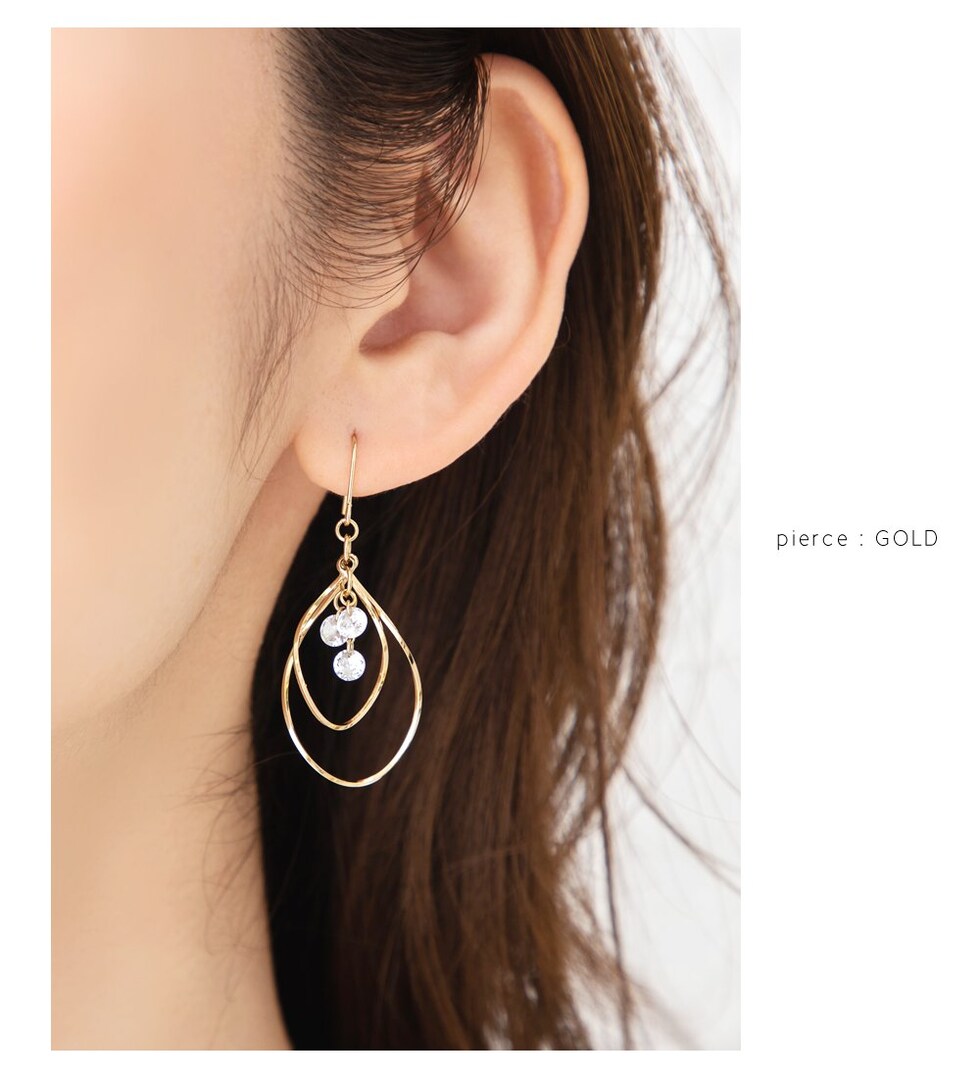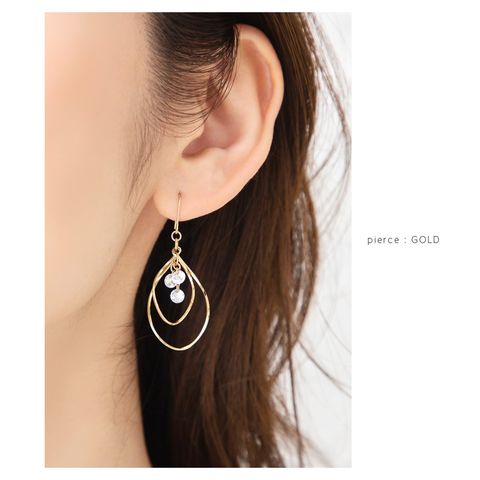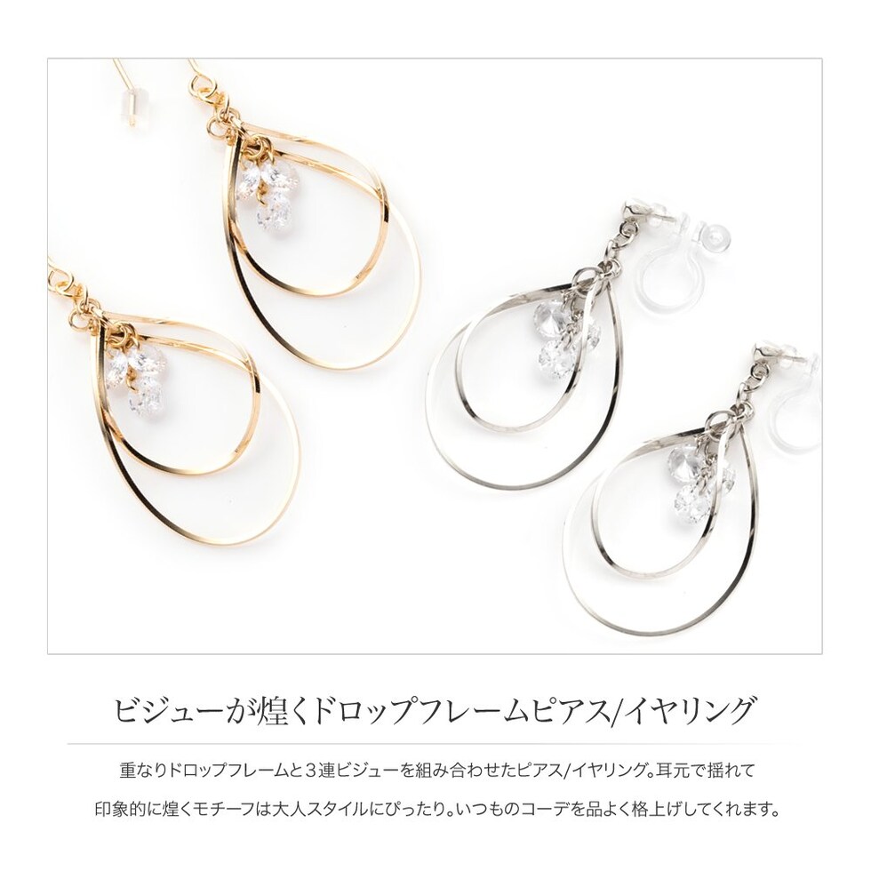 重なりドロップフレームと3連ビジューを組み合わせたピアス/イヤリング。