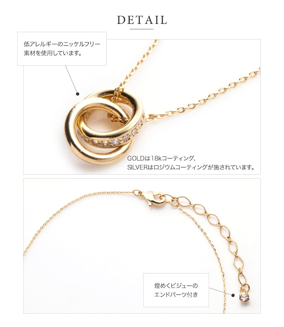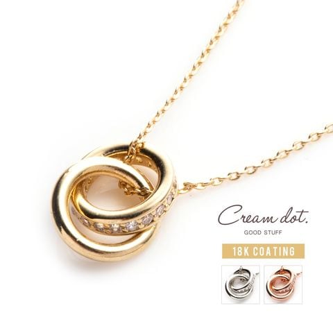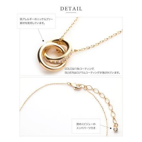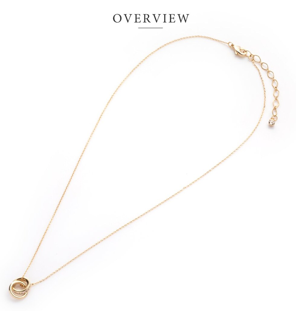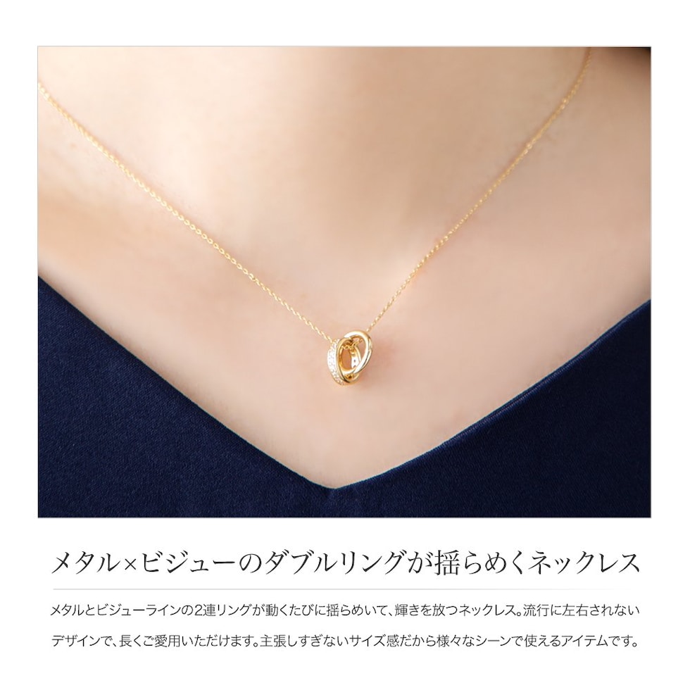 メタルとビジューラインの2連リングが動くたびに揺らめいて、輝きを放つネックレス。
