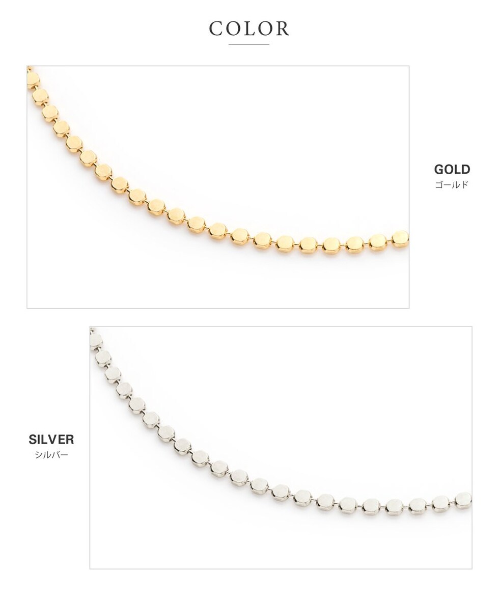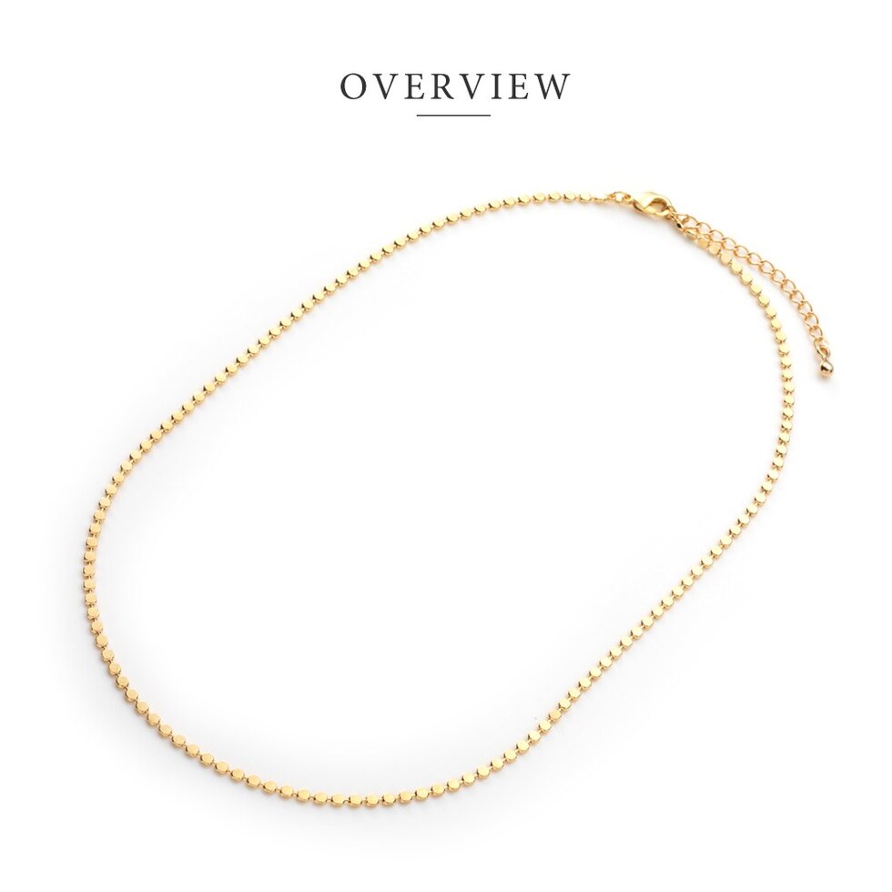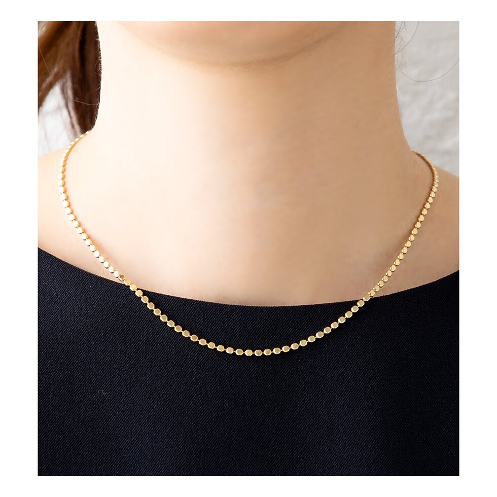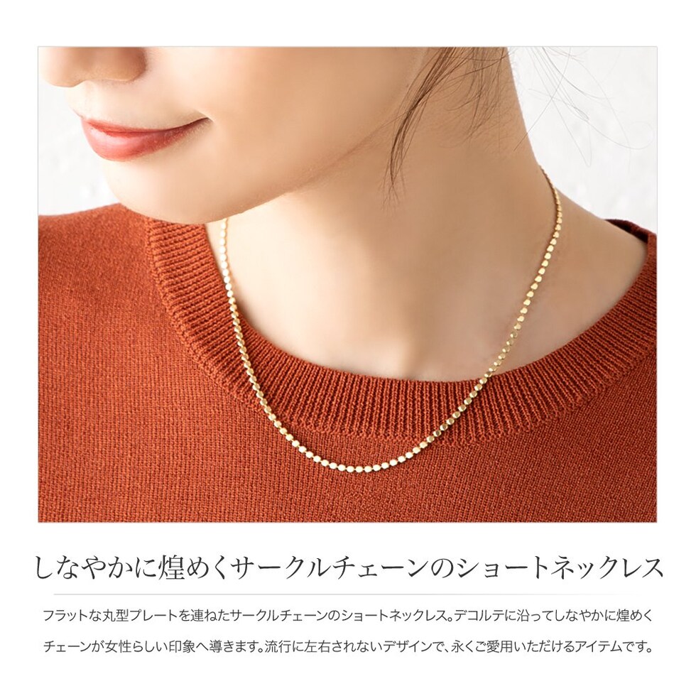 フラットな丸型プレートを連ねたサークルチェーンのショートネックレス。