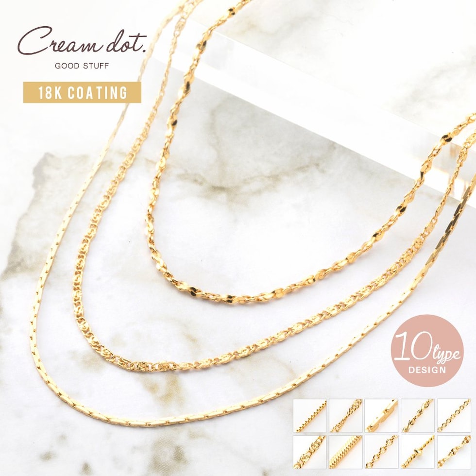 あずきチェーン、ベネチアンチェーン、スネークチェーンなど10つのデザインと長さを選べるネックレスチェーン。単品使いは勿論、重ね付けやお手持ちのネックレストップと組み合わせて様々なシーンで活躍してくれます◎