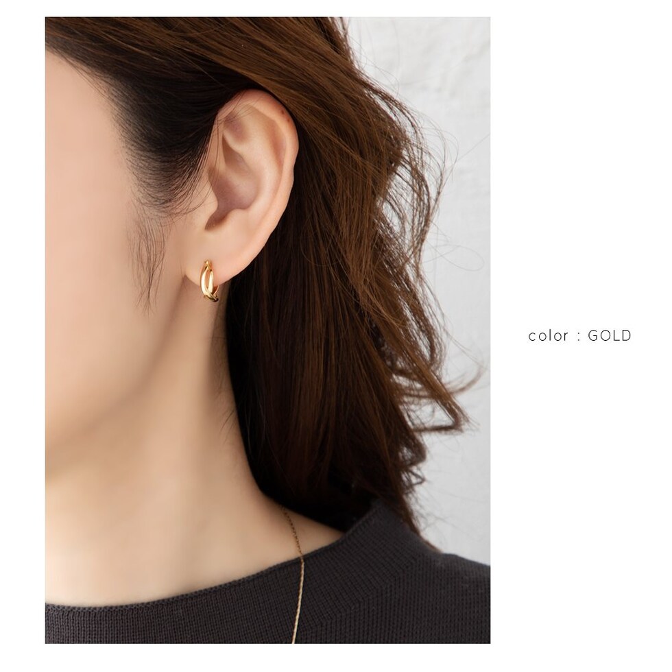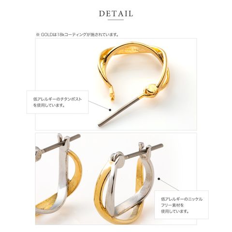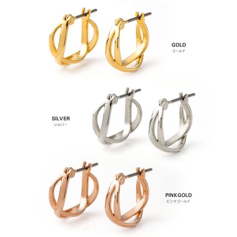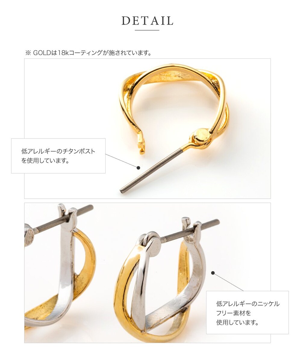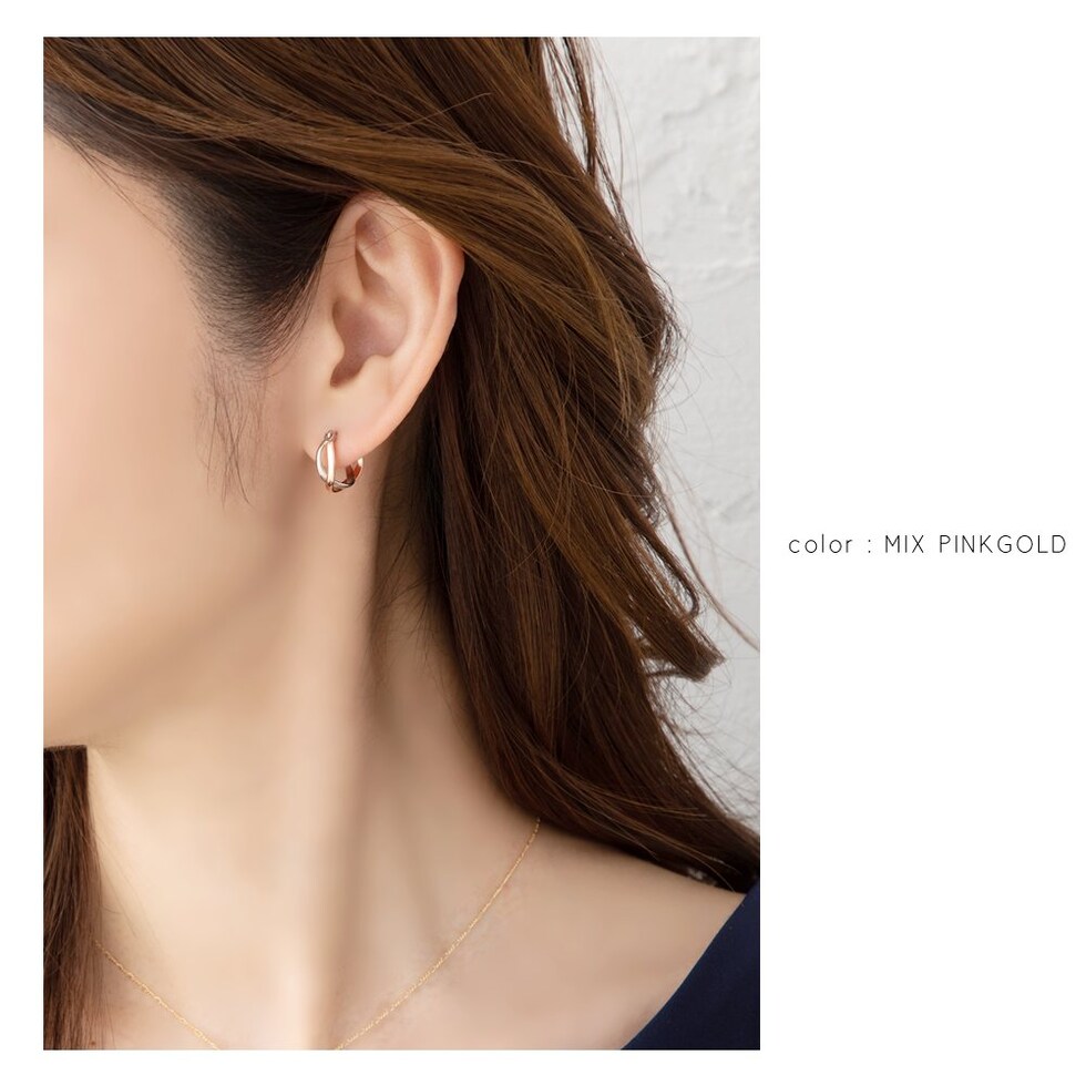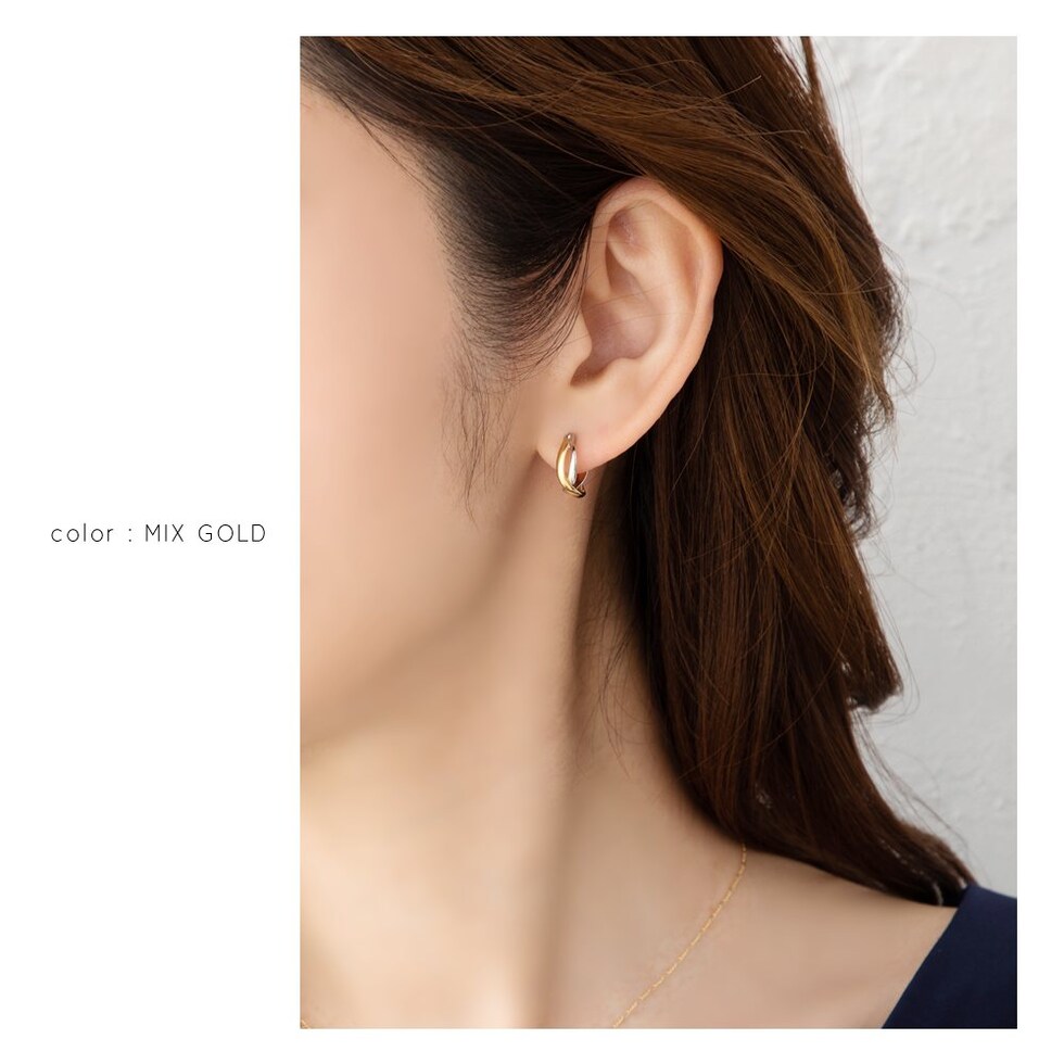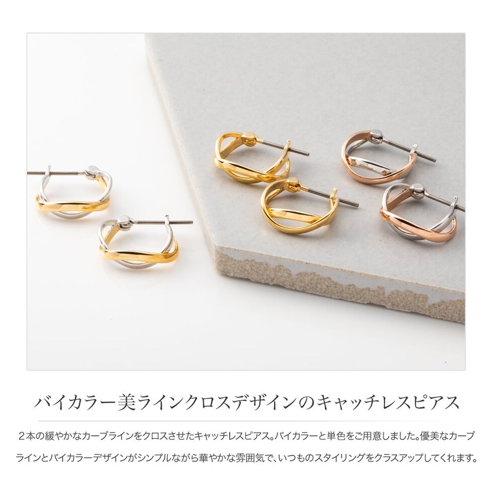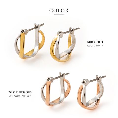 2本の緩やかなカーブラインをクロスさせたキャッチレスピアス。バイカラーと単色をご用意しました。優美なカーブラインとバイカラーデザインがシンプルながら華やかな雰囲気で、いつものスタイリングをクラスアップしてくれます。