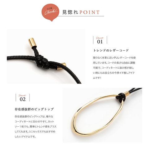 限りなく本革に近いPUレザーコードを使用しています。コードの長さも自由に調整可能で、コーディネートに抜け感が欲しい時にもお役立ちの今季イチ推しアイテムです!