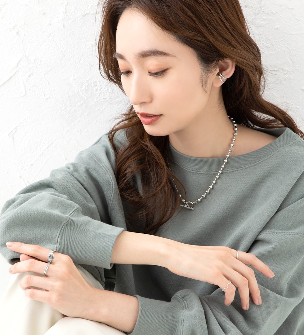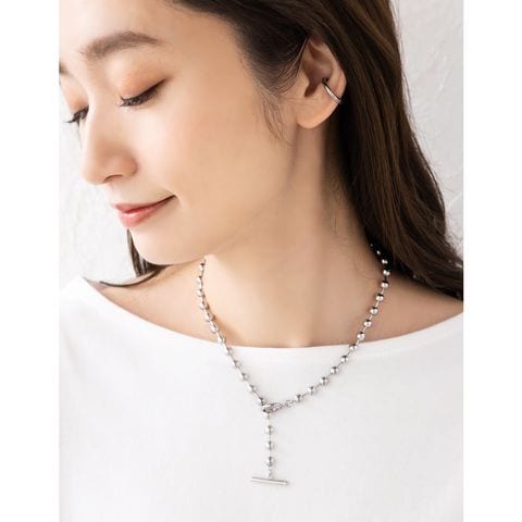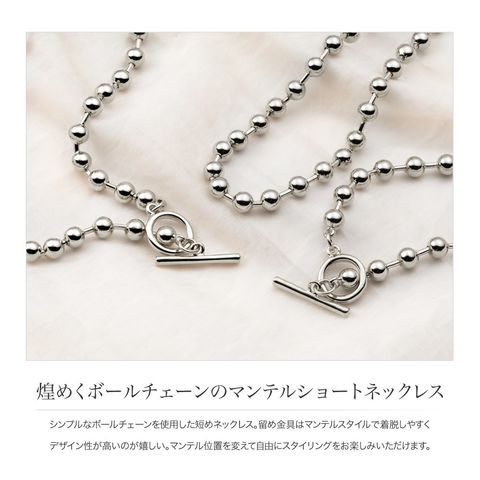 シンプルなボールチェーンを使用した短めネックレス。留め金具はマンテルスタイルで着脱しやすくデザイン性が高いのが嬉しい。マンテル位置を変えて自由にスタイリングをお楽しみいただけます。