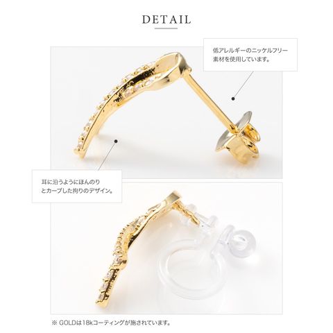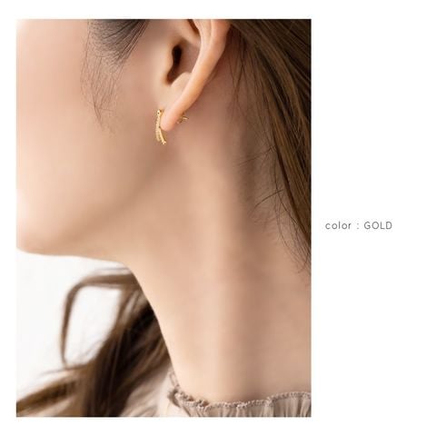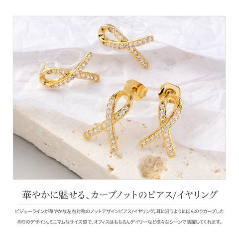 ビジューラインが華やかな左右対称のノットデザインピアス/イヤリング。耳に沿うようにほんのりカーブした拘りのデザイン。ミニマムなサイズ感で、オフィスはもちろんデイリーなど様々なシーンで活躍してくれます。