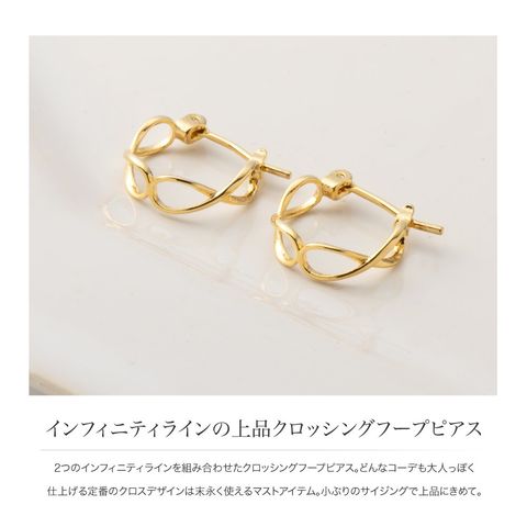 2つのインフィニティラインを組み合わせたクロッシングフープピアス。どんなコーデも大人っぽく仕上げる定番のクロスデザインは末永く使えるマストアイテム。小ぶりのサイジングで上品にきめて。