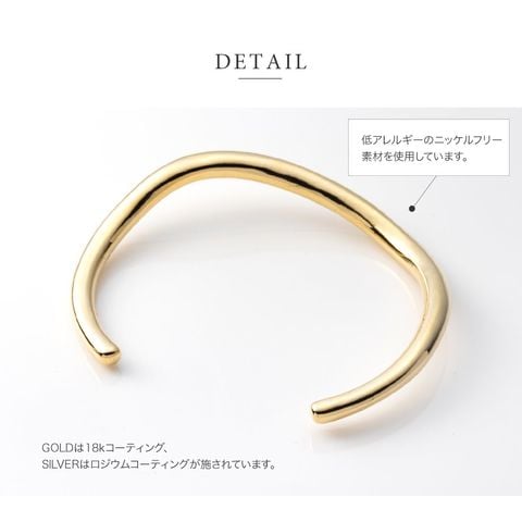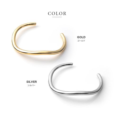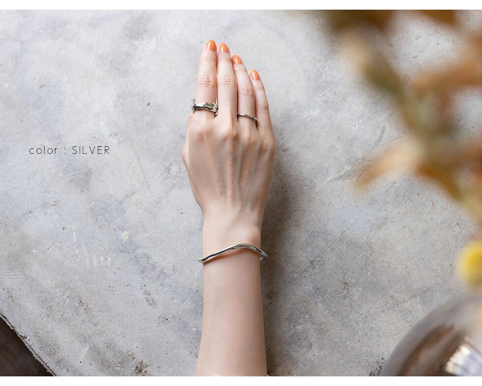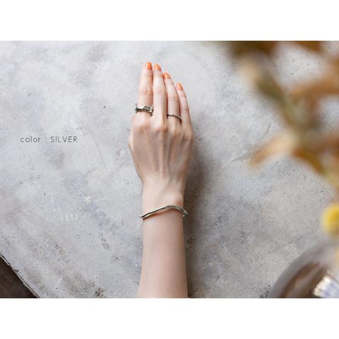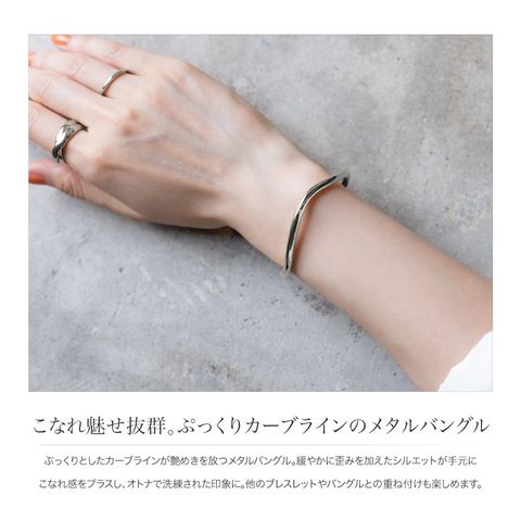 ぷっくりとしたカーブラインが艶めきを放つメタルバングル。緩やかに歪みを加えたシルエットが手元にこなれ感をプラスし、オトナで洗練された印象に。他のブレスレットやバングルとの重ね付けも楽しめます。