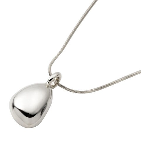 アシンメトリーなメタルにちょっぴり歪みを加えたぷっくりフォルムと、艶感のあるスネークチェーンが大人可愛いいアイテム。