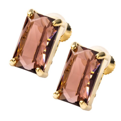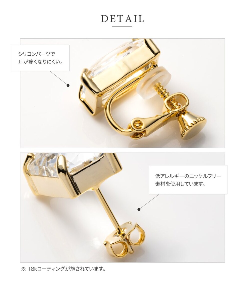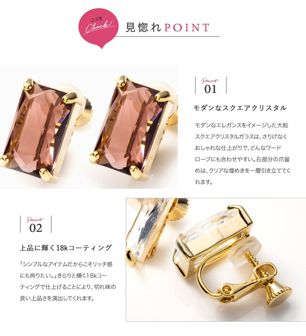 モダンなエレガンスをイメージした大粒スクエアクリスタルガラスは、さりげなくおしゃれな仕上がりで、どんなワードローブにも合わせやすい。石部分の爪留めは、クリアな煌めきを一層引き立ててくれます。
