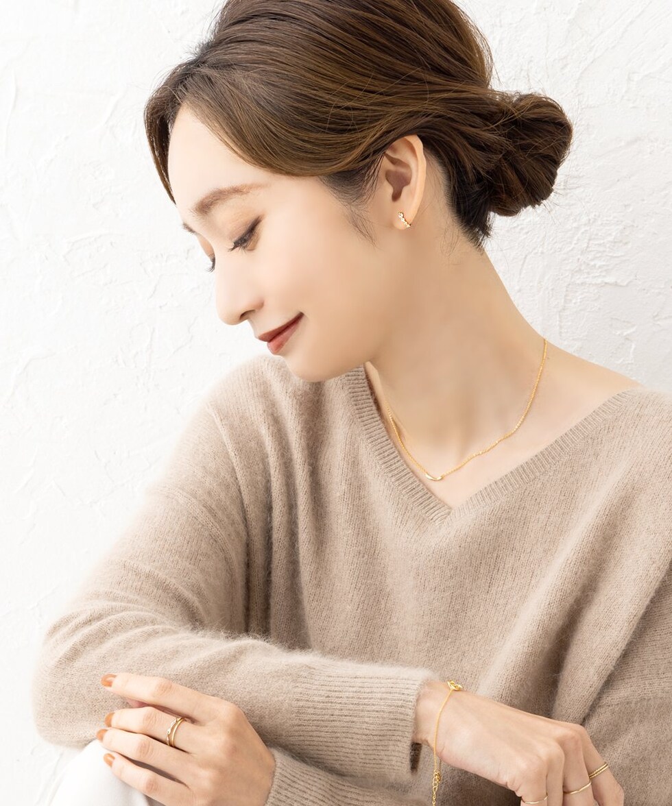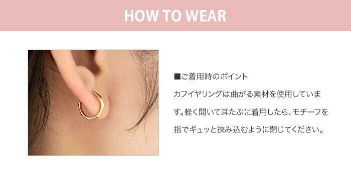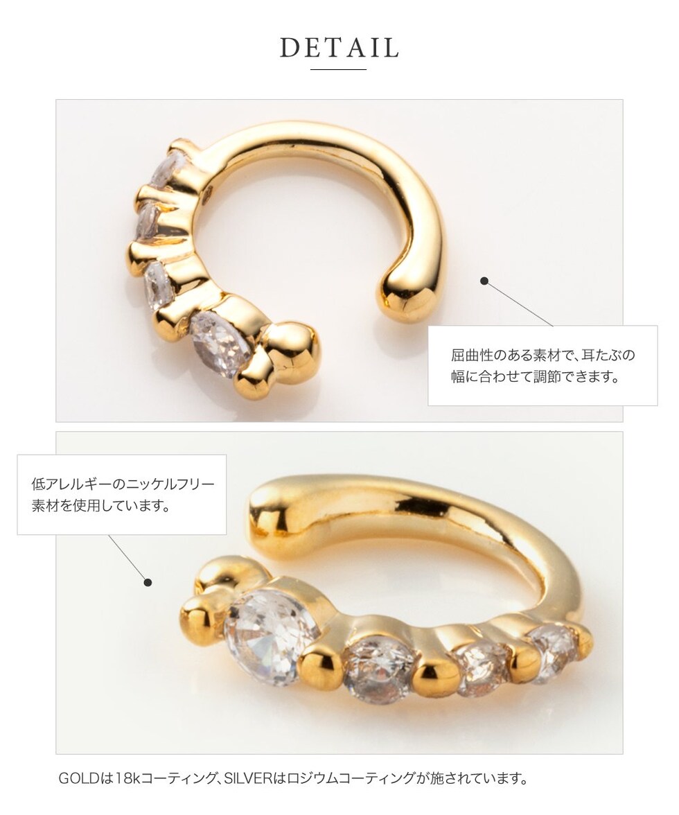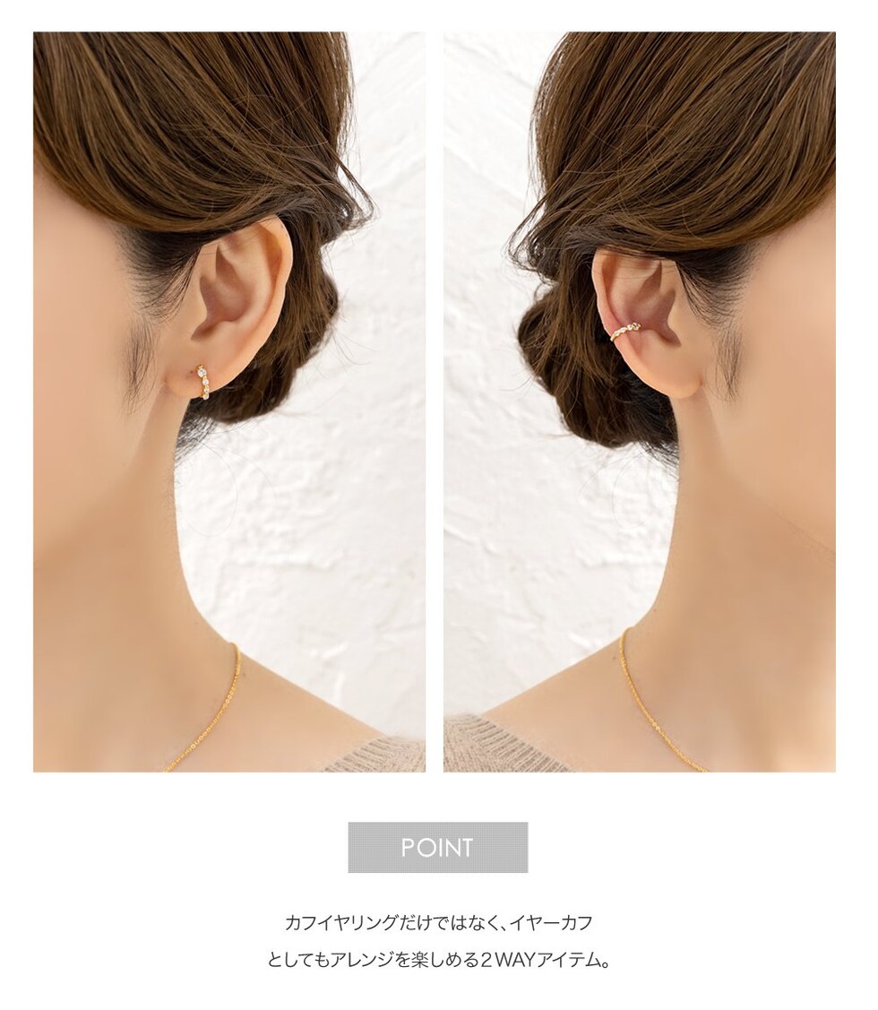 屈曲性のある素材で、耳たぶに挟みこむだけでピアス見えする新感覚アクセサリー『カフイヤリング』。大きさの異なる煌めくビジューラインが耳元を華やかに彩ります。イヤーカフとしても使える2WAYデザインなのも魅力。