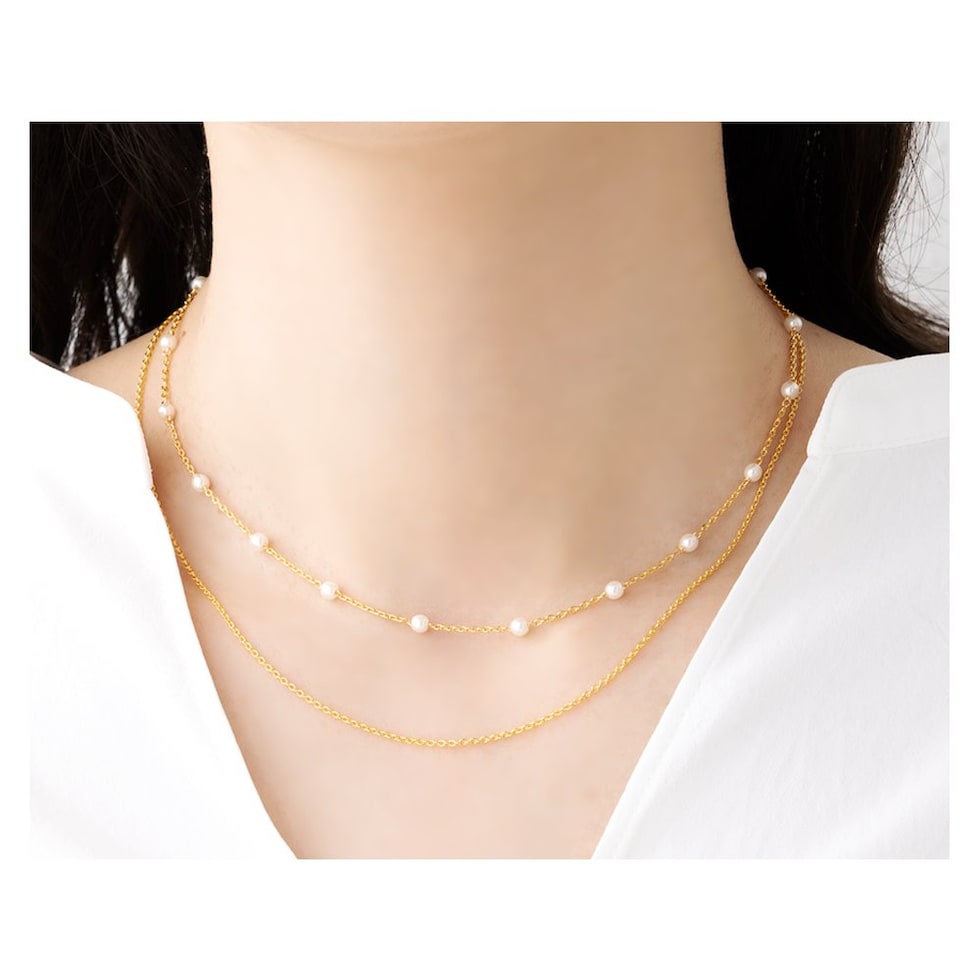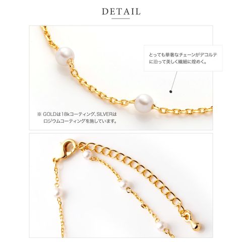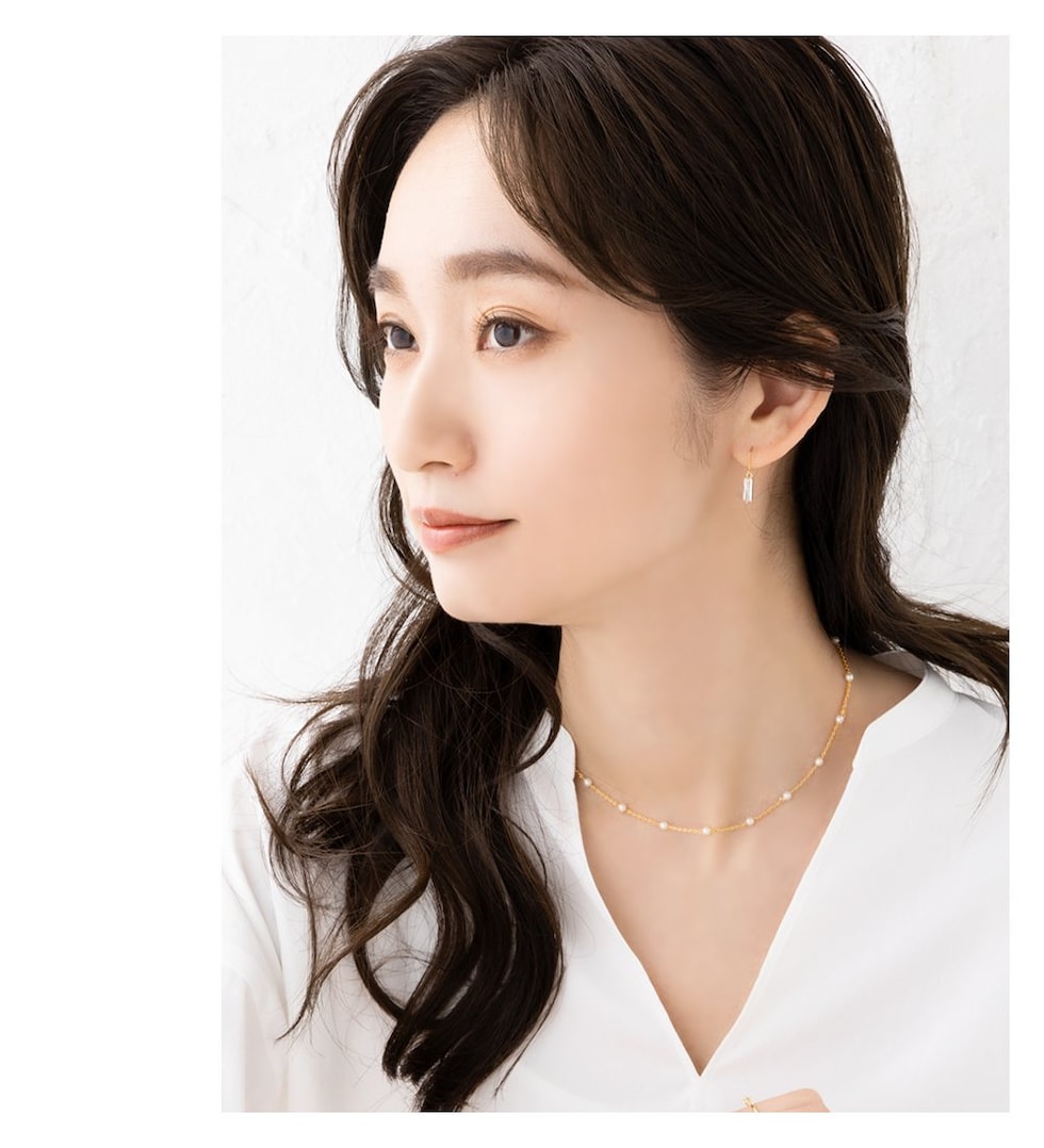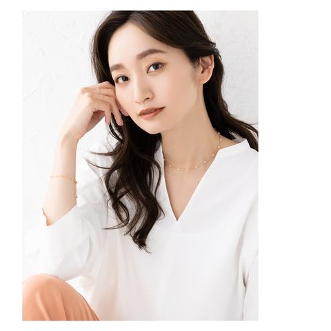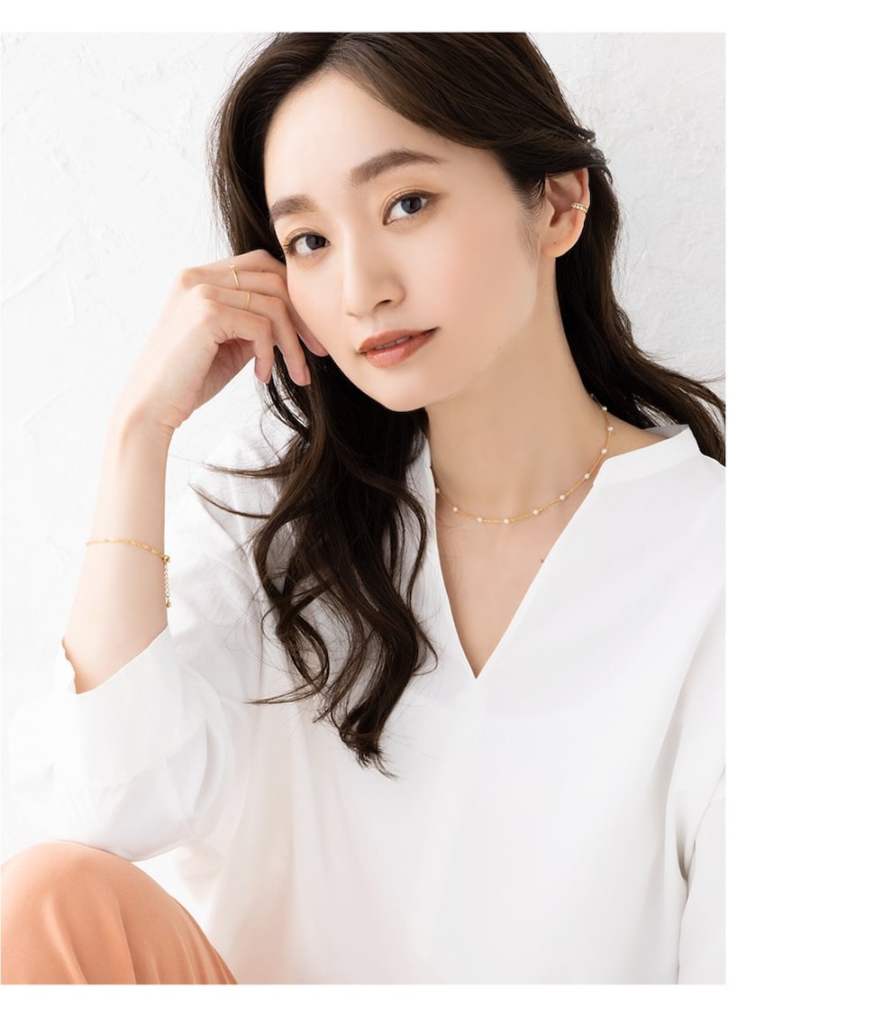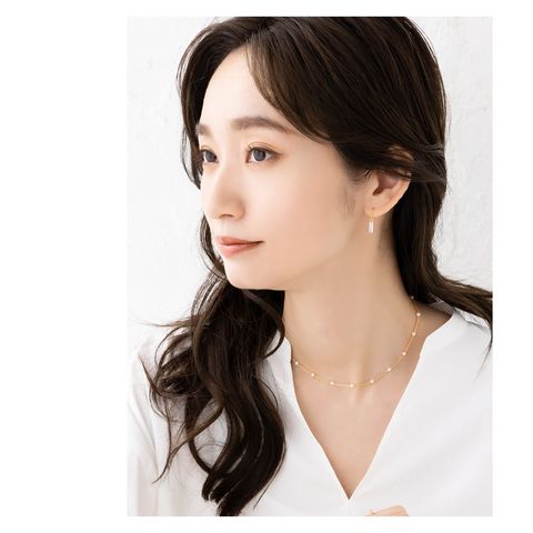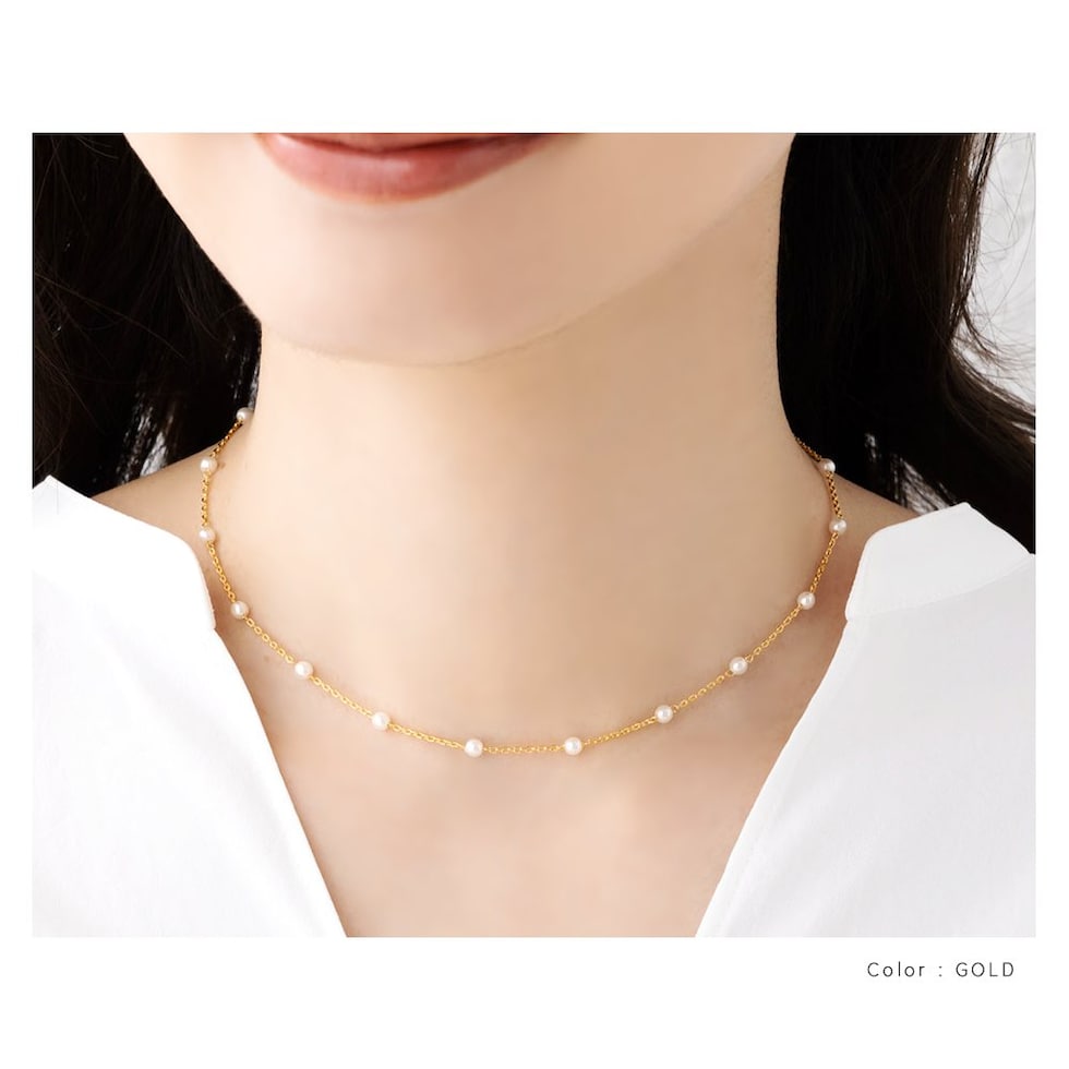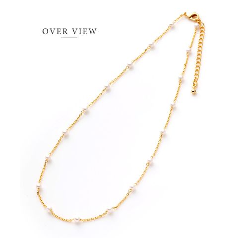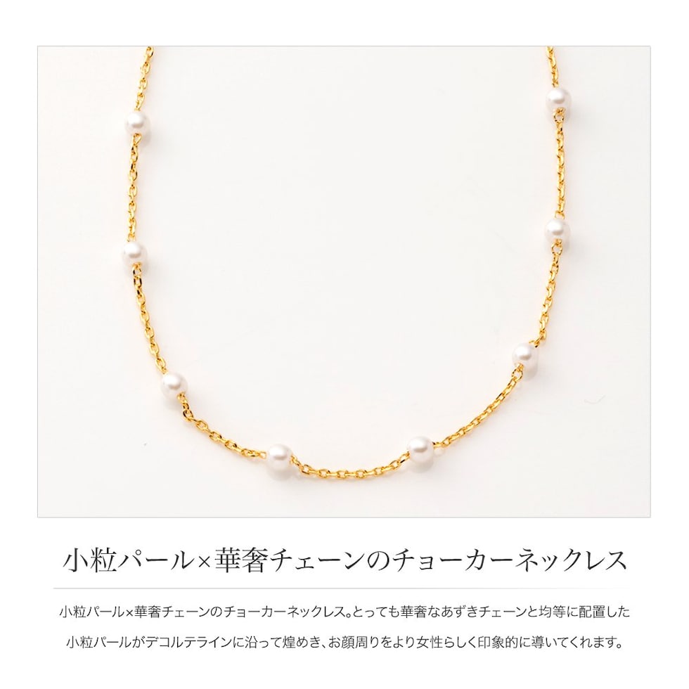 小粒パール×華奢チェーンのチョーカーネックレス。とっても華奢なあずきチェーンと均等に配置した小粒パールがデコルテラインに沿って煌めき、お顔周りをより女性らしく印象的に導いてくれます。