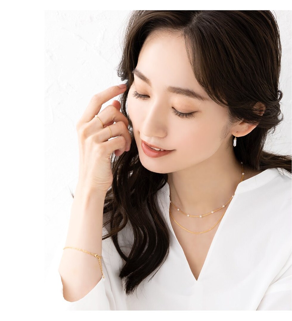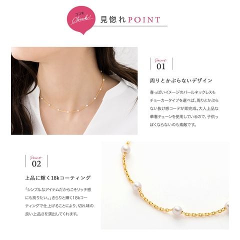 春っぽいイメージのパールネックレスもチョーカータイプを選べば、周りとかぶらない抜け感コーデが即完成。大人上品な華奢チェーンを使用しているので、子供っぽくならないのも素敵です。