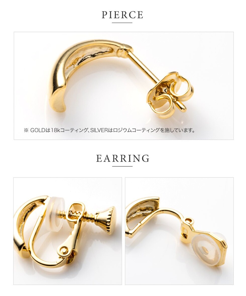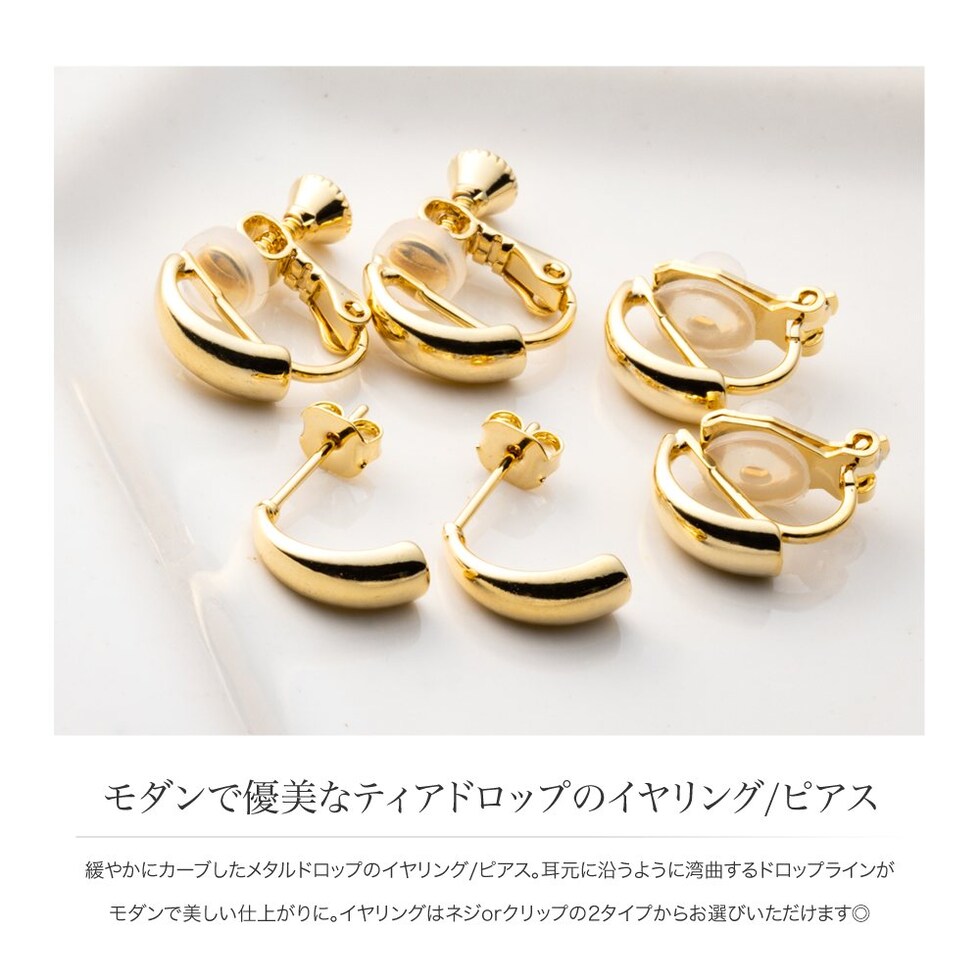 緩やかにカーブしたメタルドロップのイヤリング/ピアス。耳元に沿うように湾曲するドロップラインがモダンで美しい仕上がりに。イヤリングはネジorクリップの2タイプからお選びいただけます◎