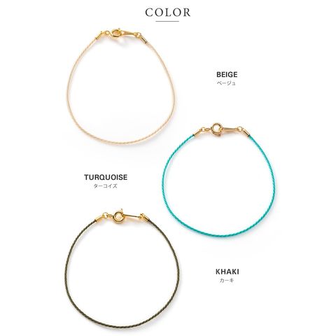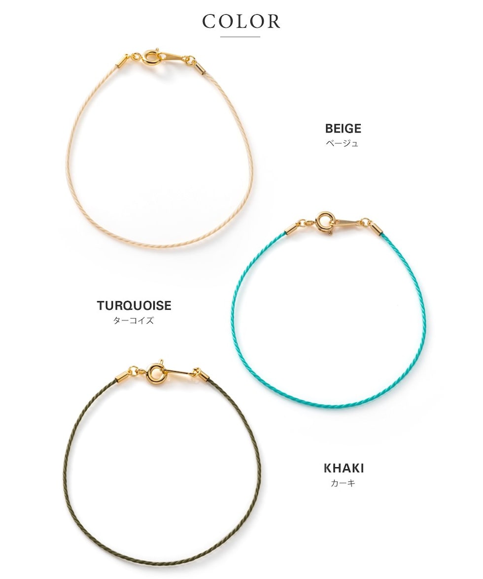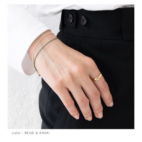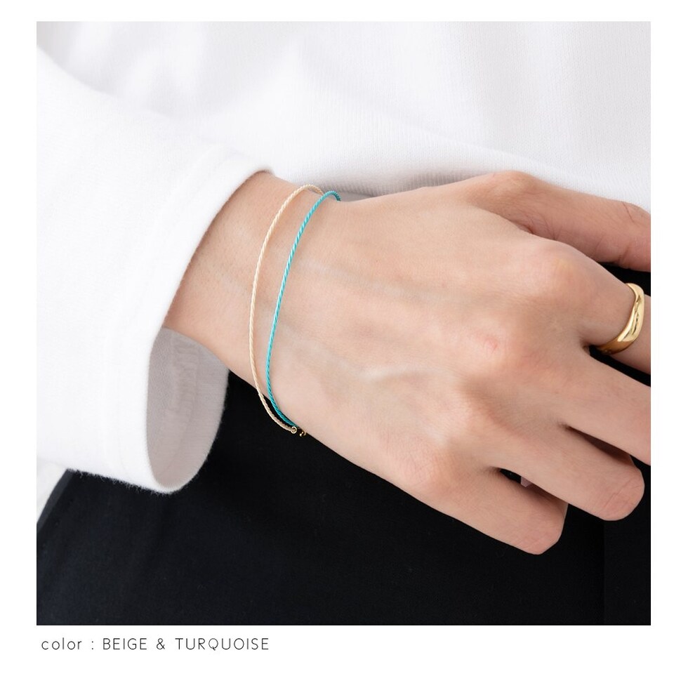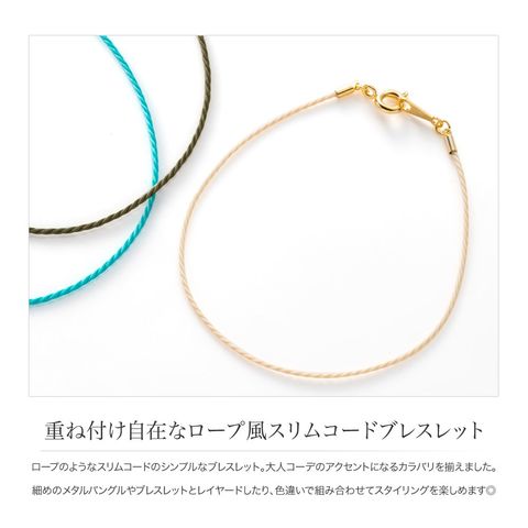 ロープのようなスリムコードのシンプルなブレスレット。大人コーデのアクセントになるカラバリを揃えました。細めのメタルバングルやブレスレットとレイヤードしたり、色違いで組み合わせてスタイリングを楽しめます◎