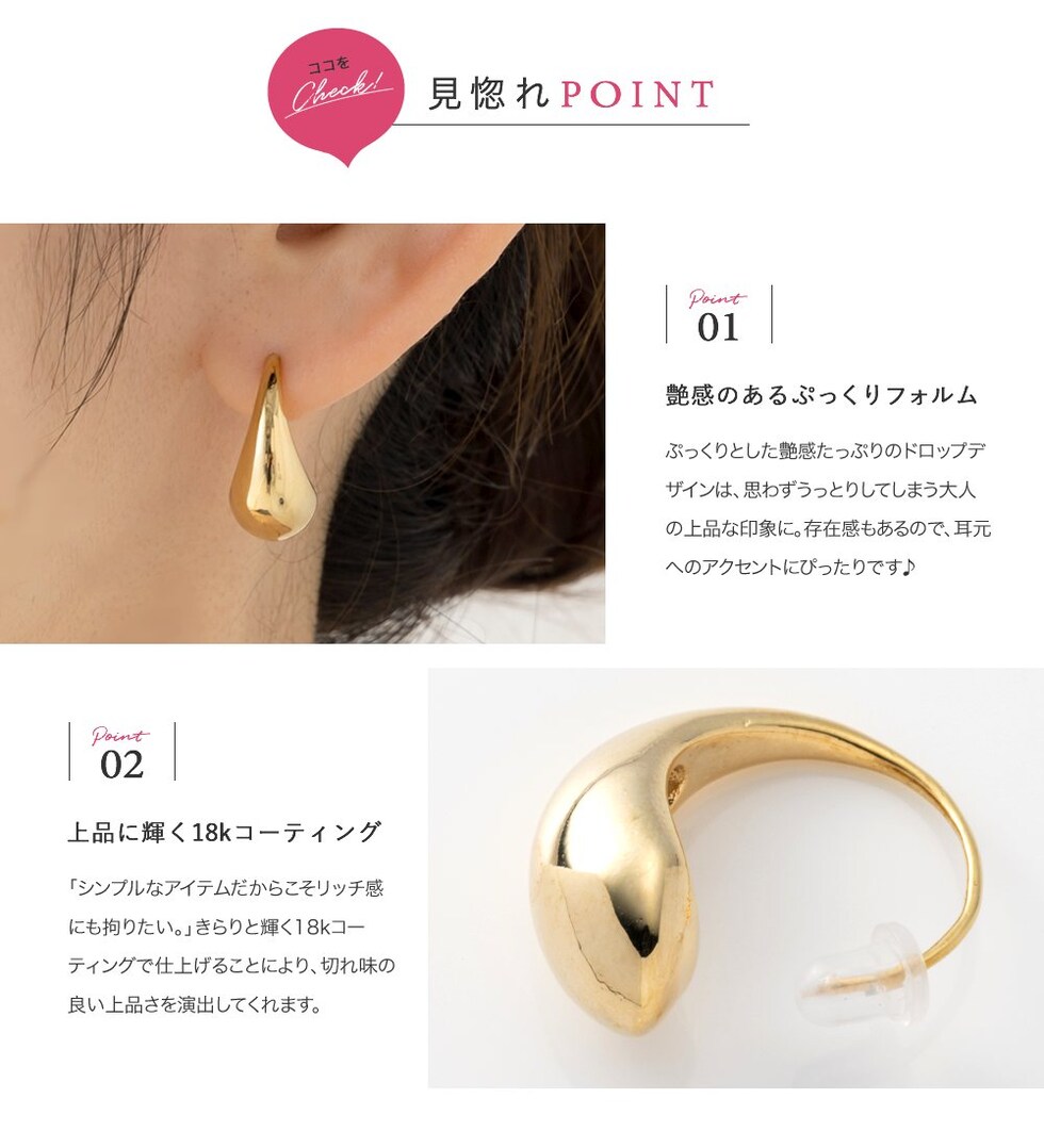 ぷっくりとした艶感たっぷりのドロップデザインは、思わずうっとりしてしまう大人の上品な印象に。存在感もあるので、耳元へのアクセントにぴったりです♪