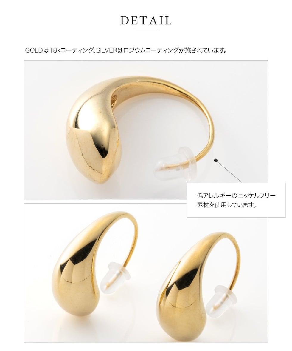 緩やかなカーブラインが美しいドロップのフープピアス。耳元を包みこむ雫のような独特な丸みが、女性らしさを引き立ててくれます。大ぶりなデザインと上品な艶感で、きれいめにもカジュアルにも合わせやすい一品です。