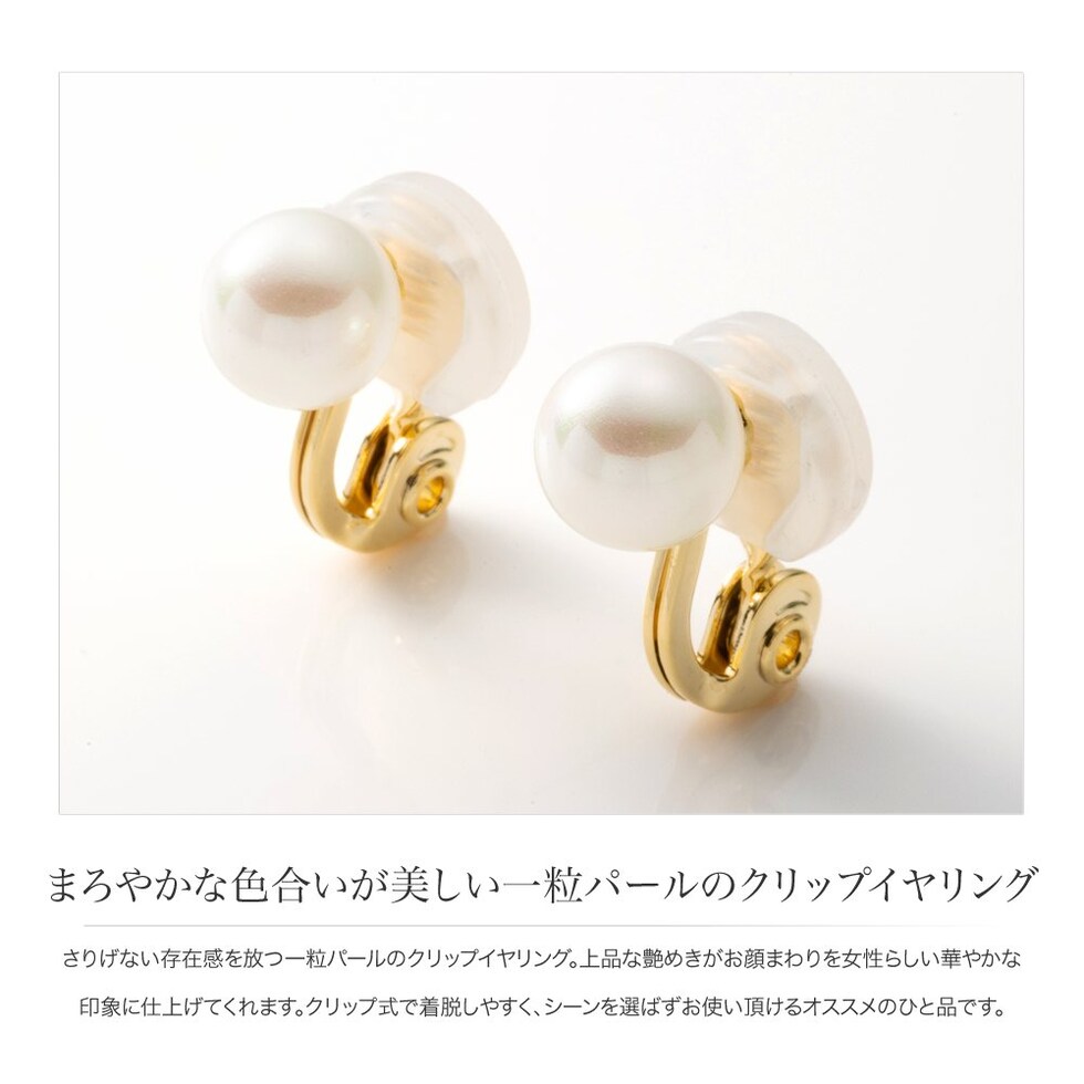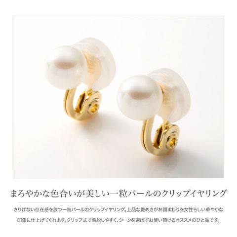 さりげない存在感を放つ一粒パールのクリップイヤリング。上品な艶めきがお顔まわりを女性らしい華やかな印象に仕上げてくれます。クリップ式で着脱しやすく、シーンを選ばずお使い頂けるオススメのひと品です。