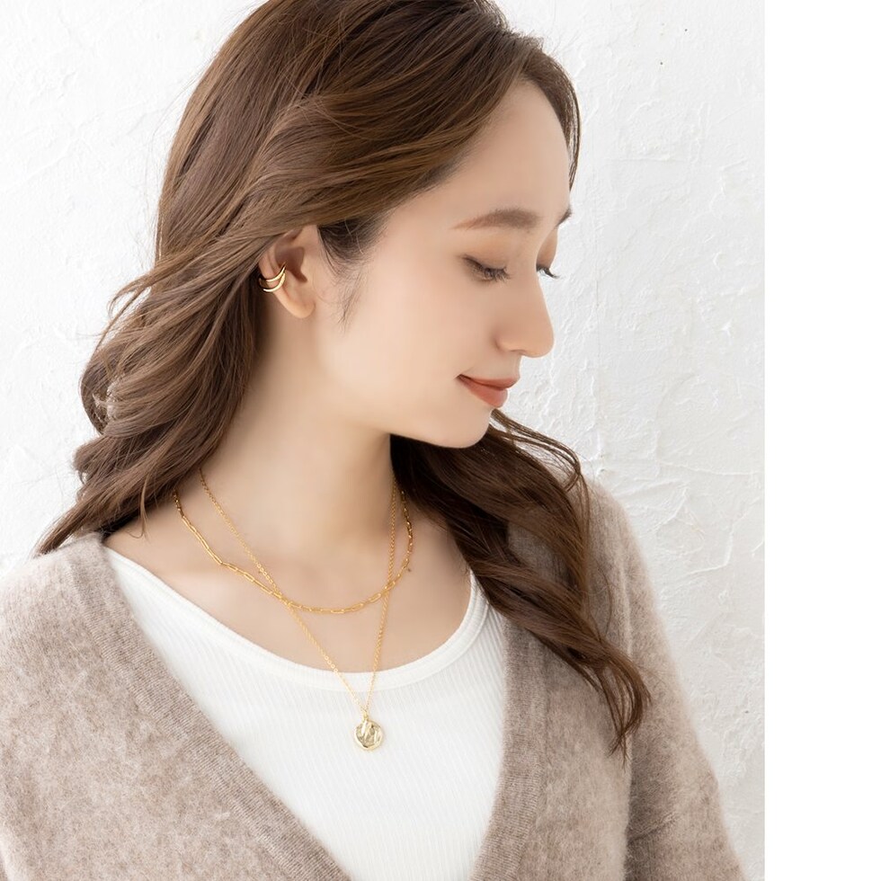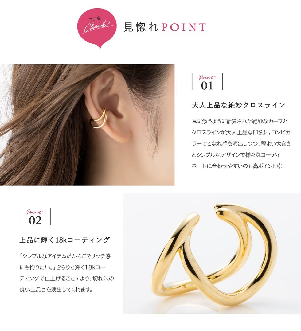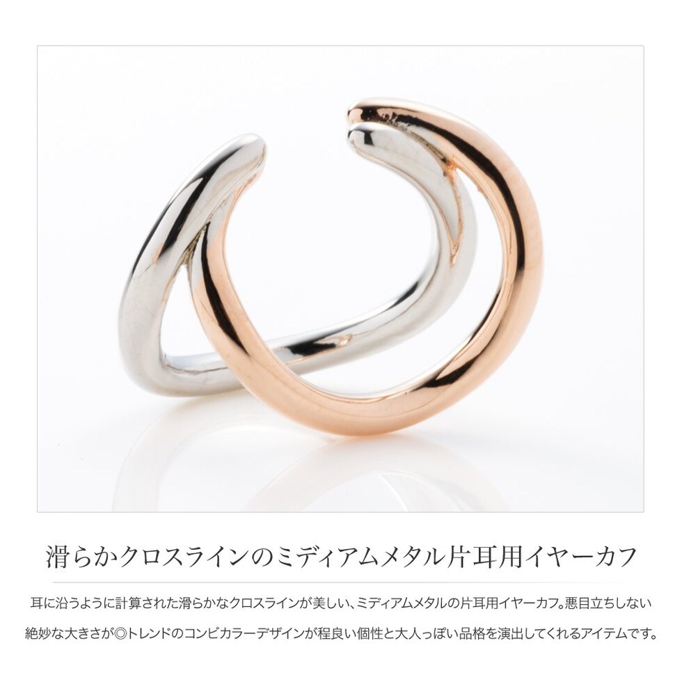 耳に沿うように計算された滑らかなクロスラインが美しい、ミディアムメタルの片耳用イヤーカフ。悪目立ちしない絶妙な大きさが◎トレンドのコンビカラーデザインが程良い個性と大人っぽい品格を演出してくれるアイテムです。