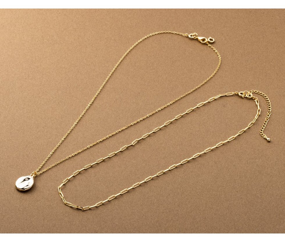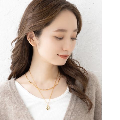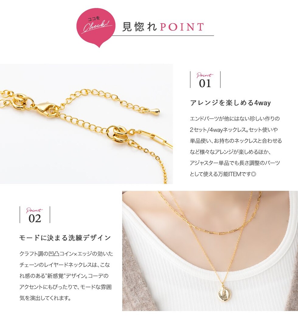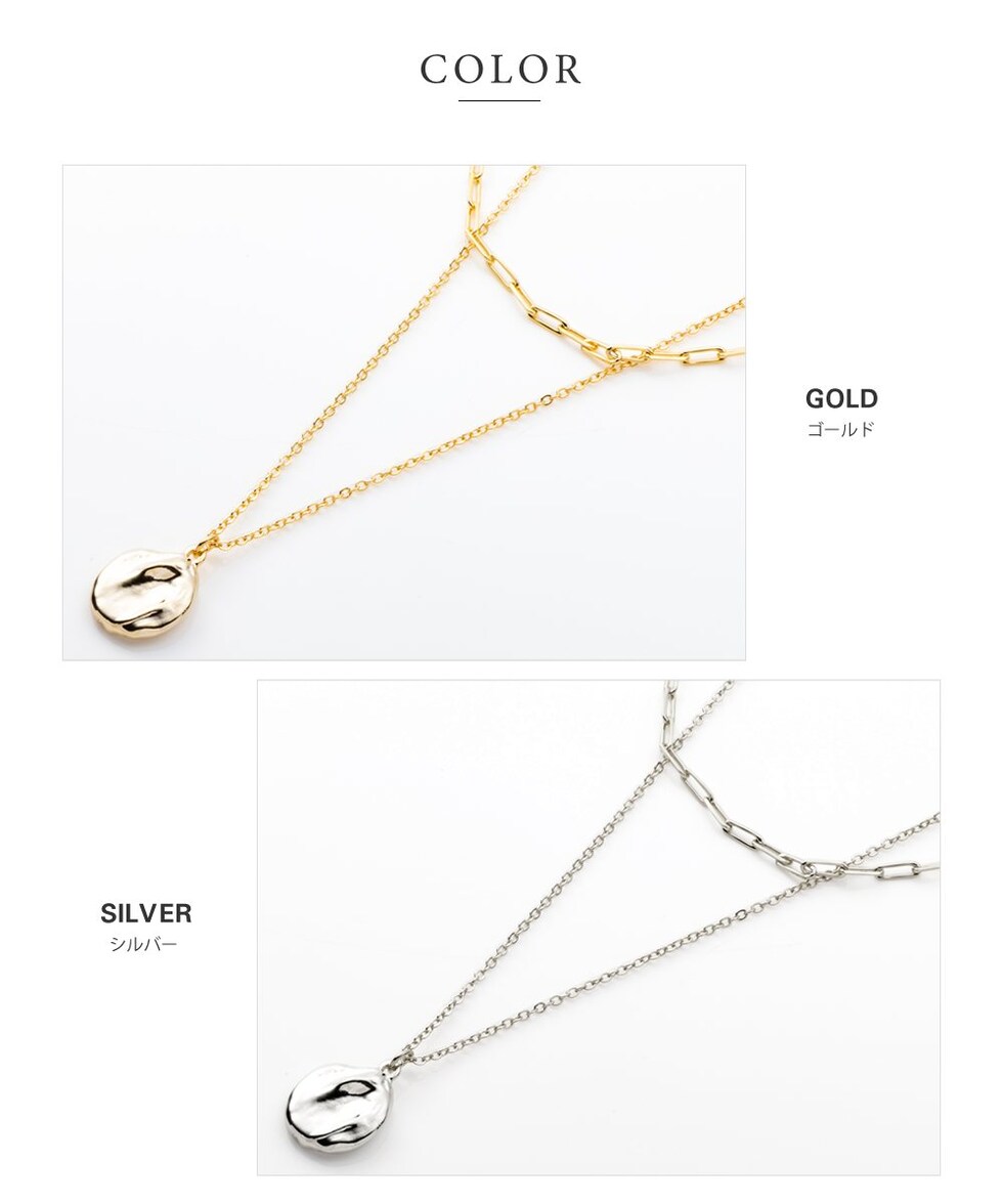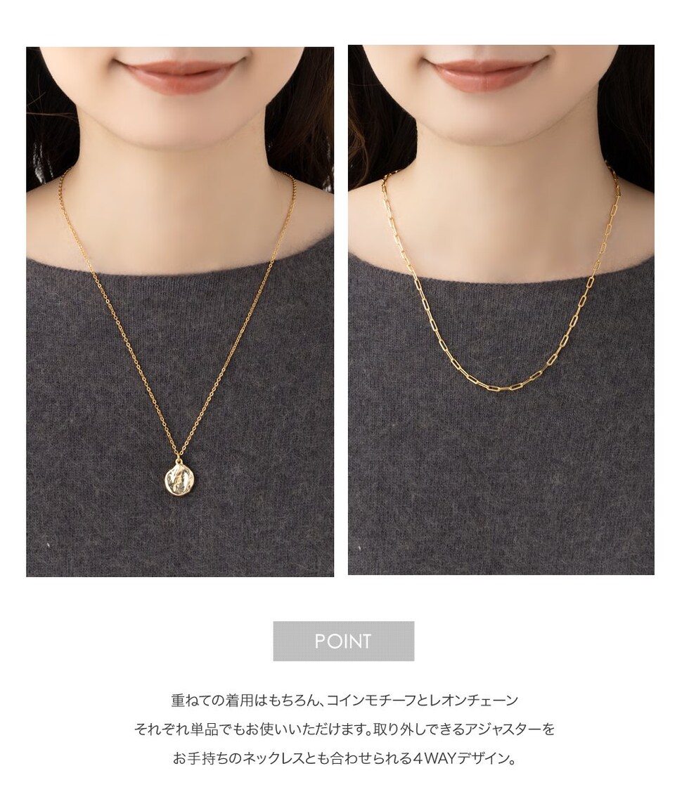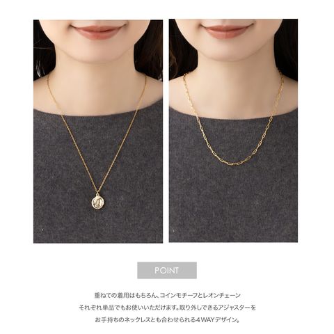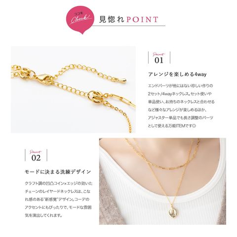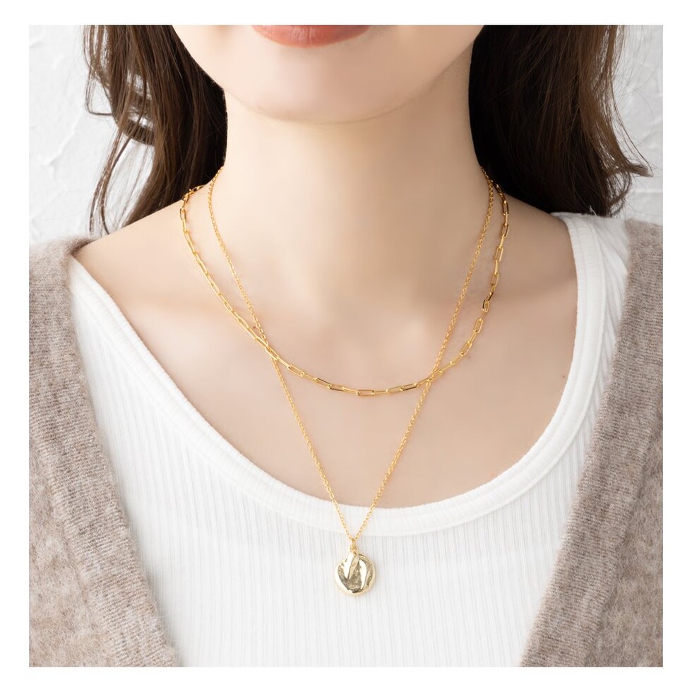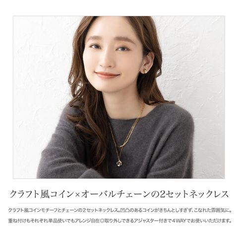 クラフト風コインモチーフとチェーンの2セットネックレス。凹凸のあるコインがきちんとしすぎず、こなれた雰囲気に。重ね付けもそれぞれ単品使いでもアレンジ自在◎取り外しできるアジャスター付きで4WAYでお使いいただけます。