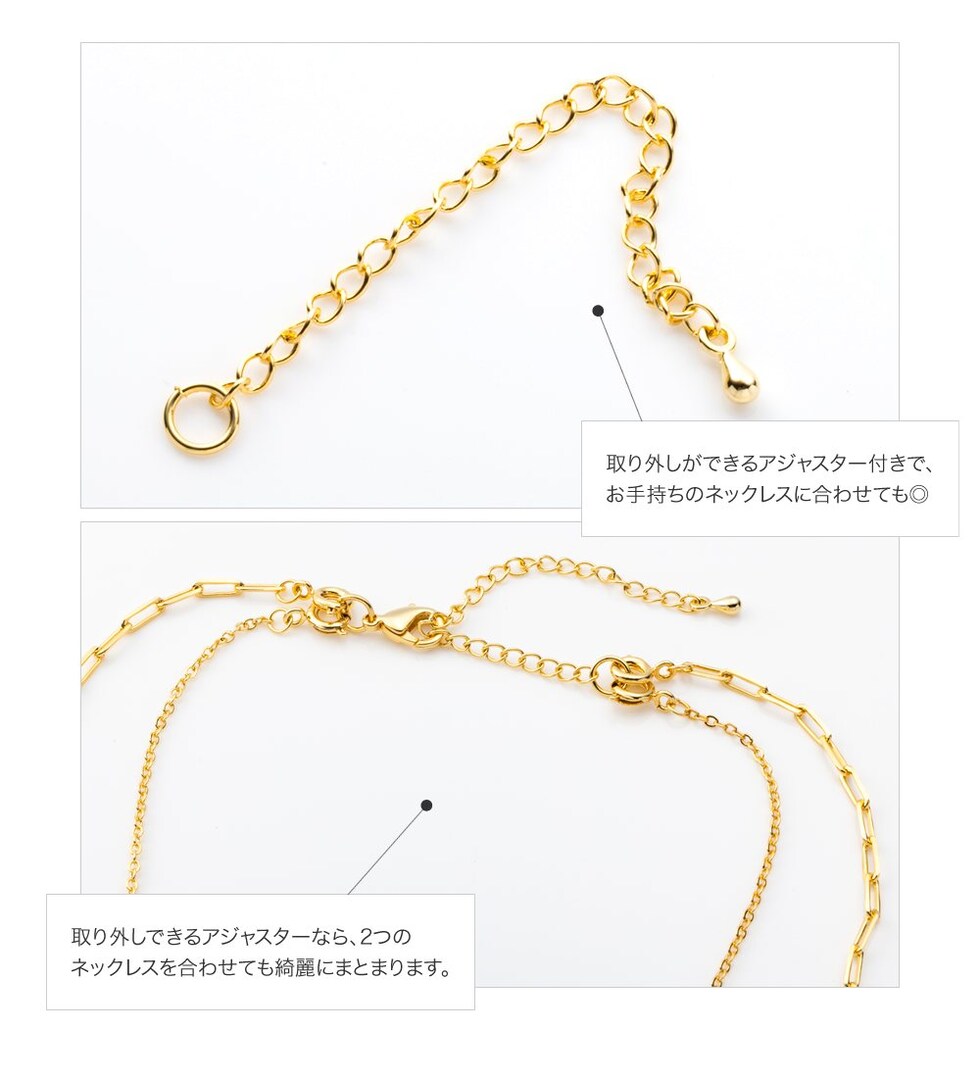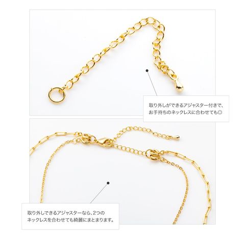 エンドパーツが他にはない珍しい作りの2セット/4wayネックレス。セット使いや単品使い、お持ちのネックレスと合わせるなど様々なアレンジが楽しめるほか、アジャスター単品でも長さ調整のパーツとして使える万能ITEMです◎