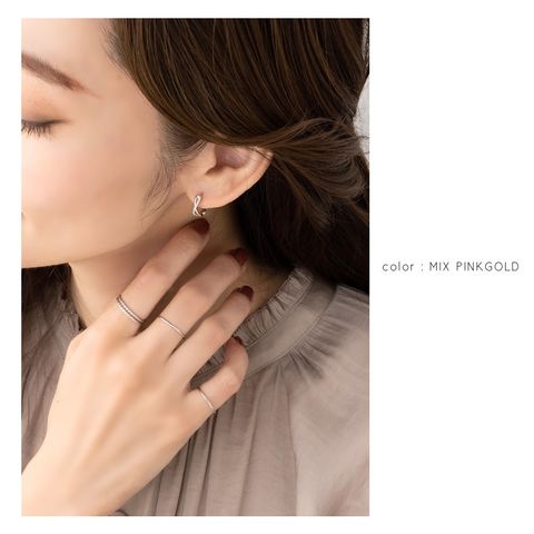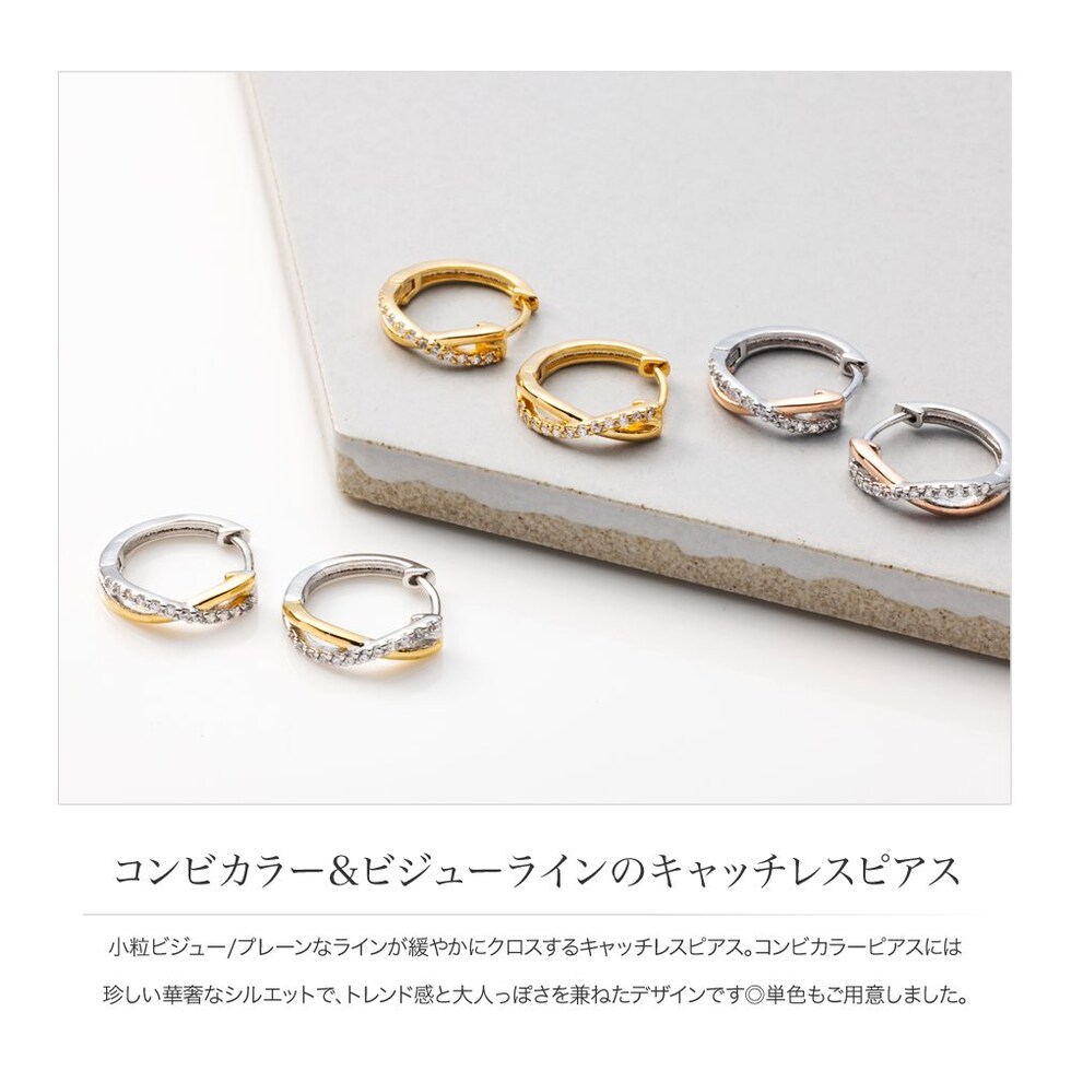 小粒ビジュー/プレーンなラインが緩やかにクロスするキャッチレスピアス。コンビカラーピアスには珍しい華奢なシルエットで、トレンド感と大人っぽさを兼ねたデザインです◎単色もご用意しました。