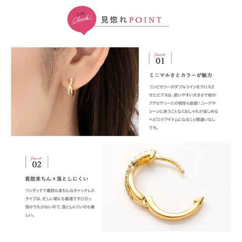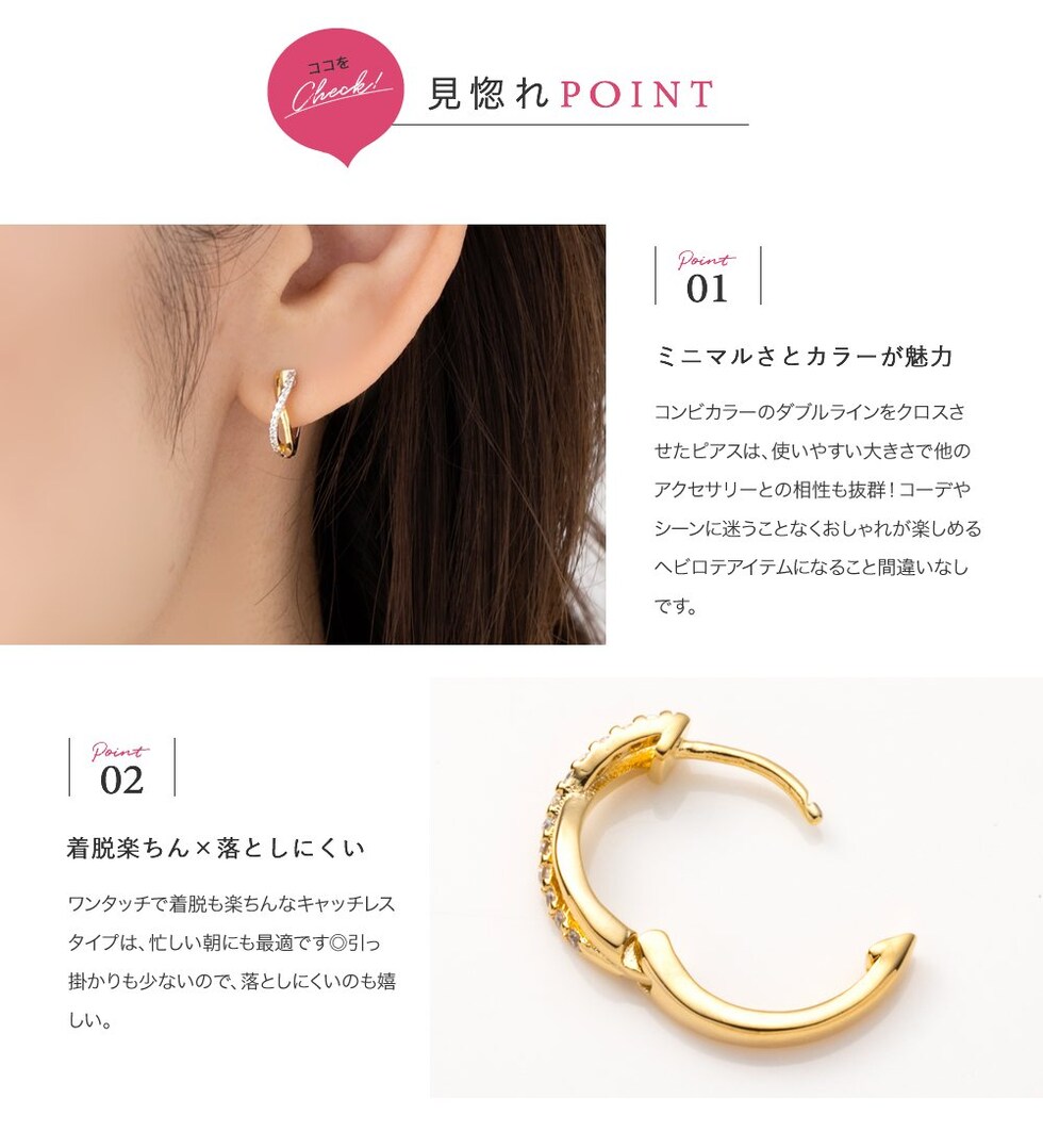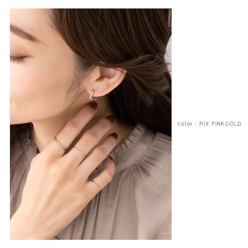 コンビカラーのダブルラインをクロスさせたピアスは、使いやすい大きさで他のアクセサリーとの相性も抜群!コーデやシーンに迷うことなくおしゃれが楽しめるヘビロテアイテムになること間違いなしです。