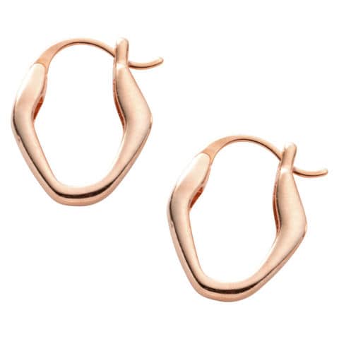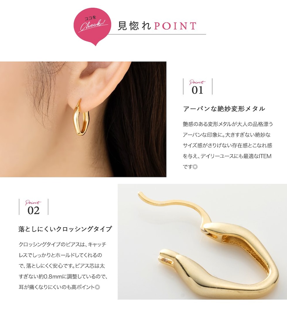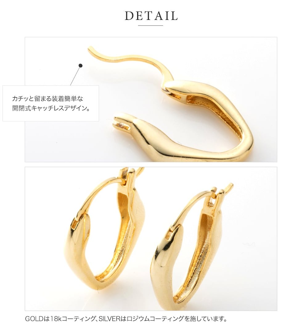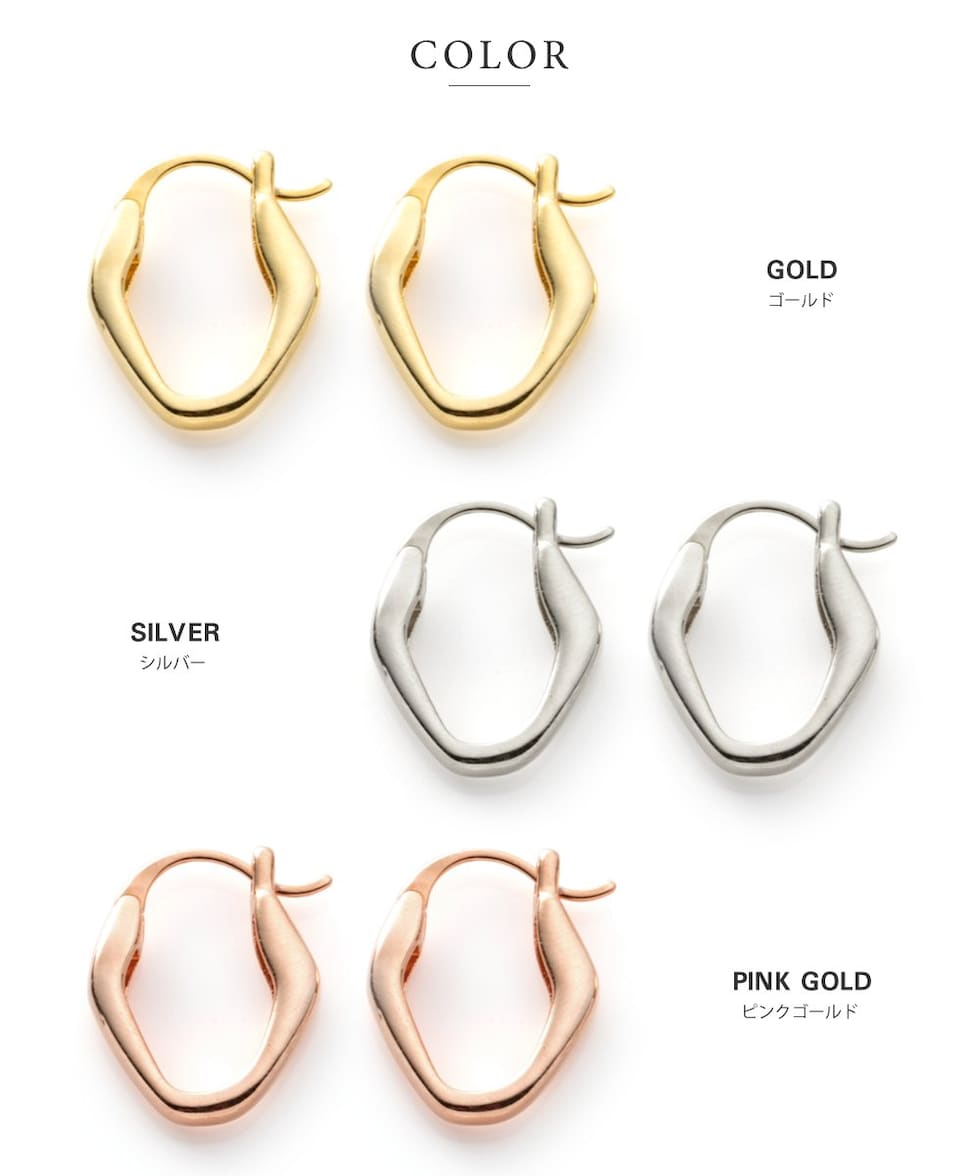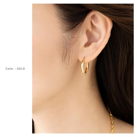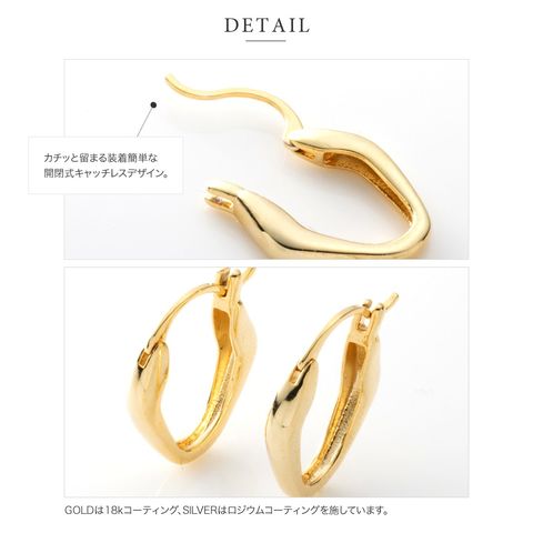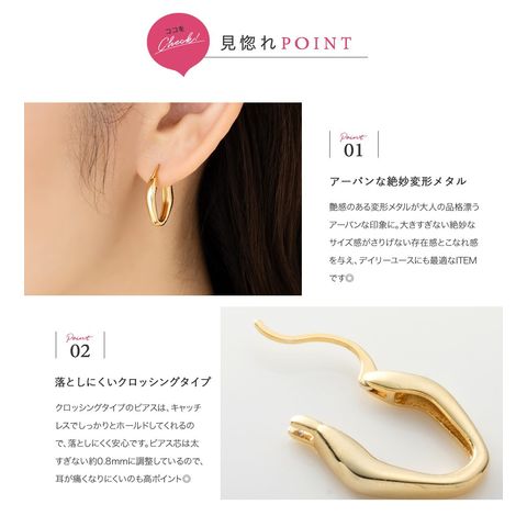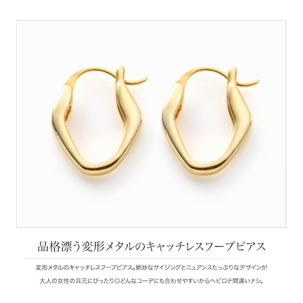 変形メタルのキャッチレスフープピアス。絶妙なサイジングとニュアンスたっぷりなデザインが大人の女性の耳元にぴったり◎どんなコーデにも合わせやすいからヘビロテ間違いナシ。