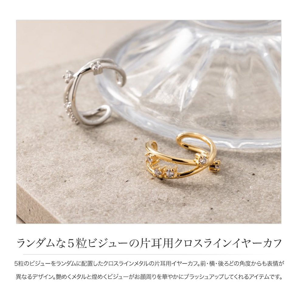 5粒のビジューをランダムに配置したクロスラインメタルの片耳用イヤーカフ。前・横・後ろどの角度からも表情が異なるデザイン。艶めくメタルと煌めくビジューがお顔周りを華やかにブラッシュアップしてくれるアイテムです。