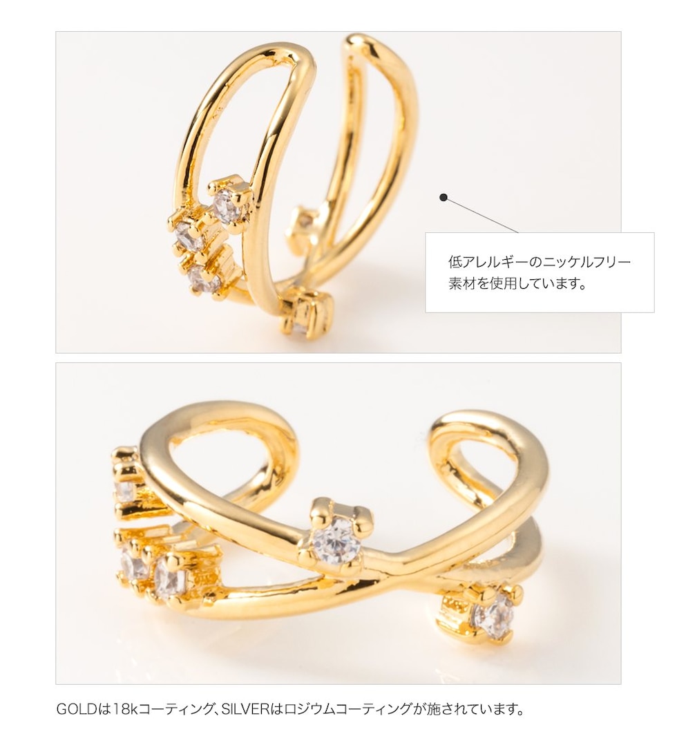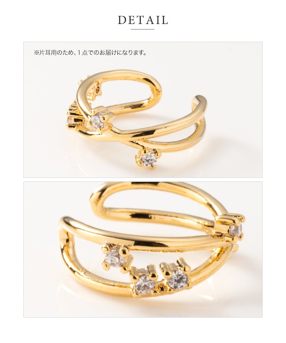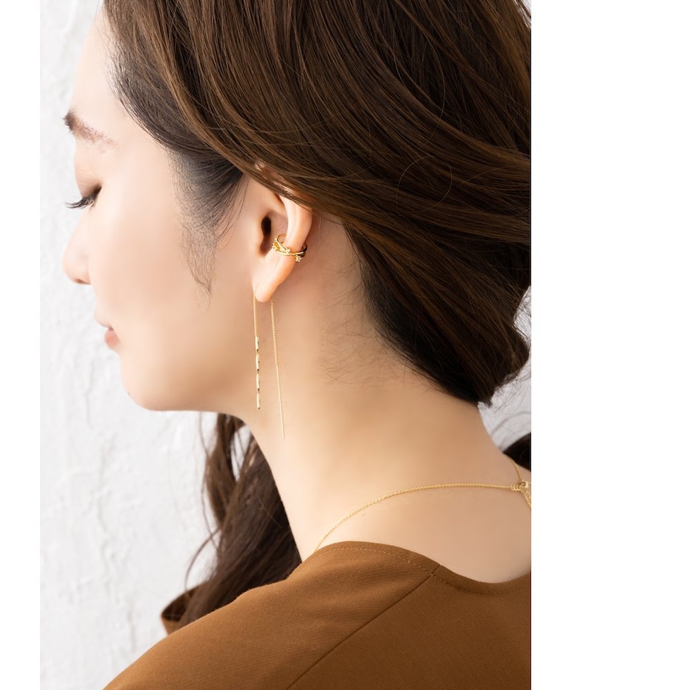 クロスラインに5粒ビジューをランダムに配したイヤーカフは、耳元で女性らしい繊細な煌めきを放ちます。普段使いはもちろん、オケージョンなど様々なシーンで大活躍すること間違いなし。
