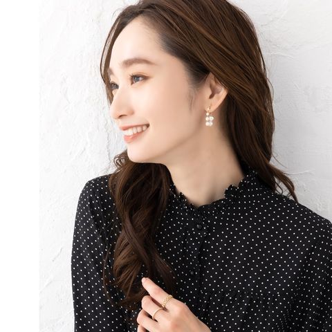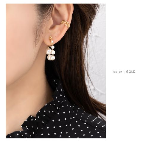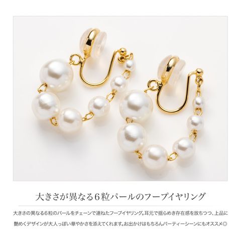 大きさの異なる6粒のパールをチェーンで連ねたフープイヤリング。耳元で揺らめき存在感を放ちつつ、上品に艶めくデザインが大人っぽい華やかさを添えてくれます。お出かけはもちろんパーティーシーンにもオススメ◎