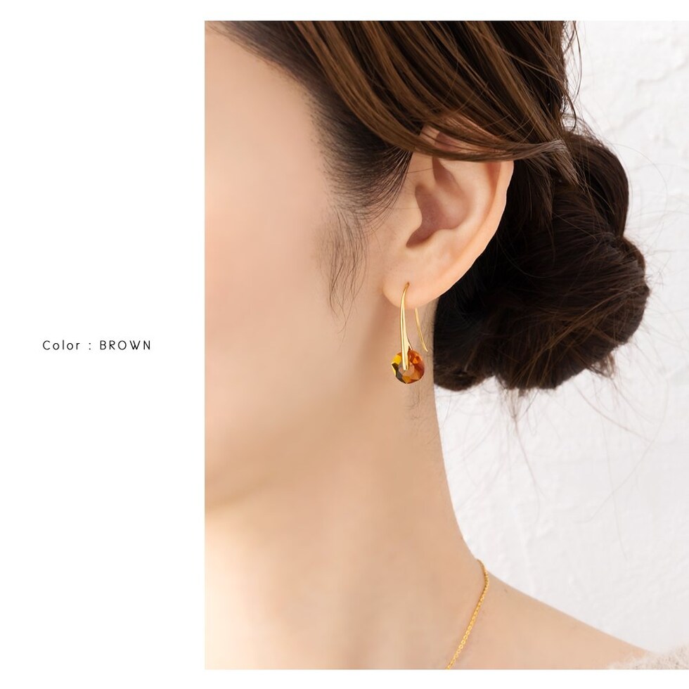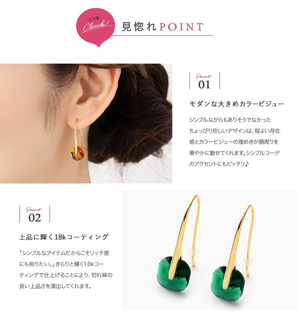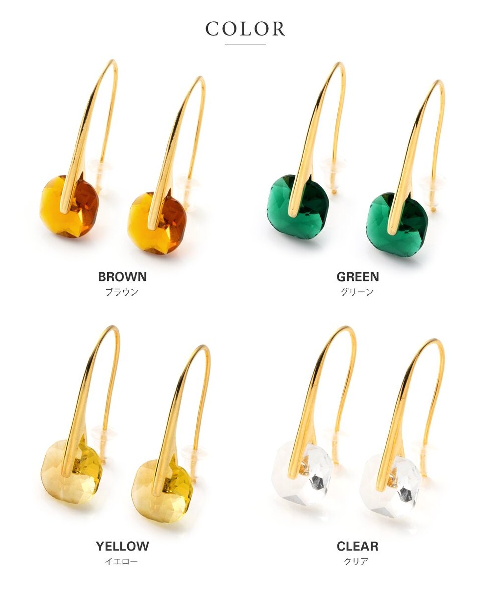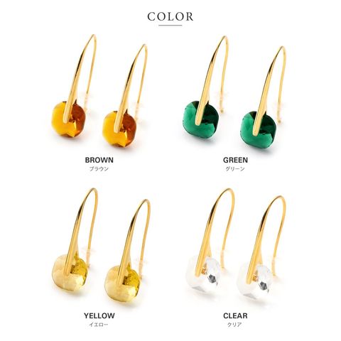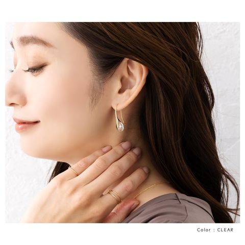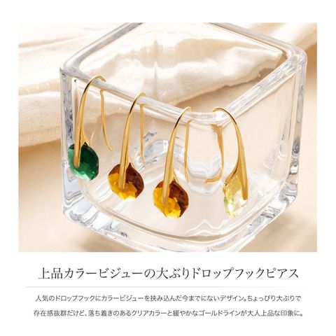 人気のドロップフックにカラービジューを挟み込んだ今までにないデザイン。ちょっぴり大ぶりで存在感抜群だけど、落ち着きのあるクリアカラーと緩やかなゴールドラインが大人上品な印象に。