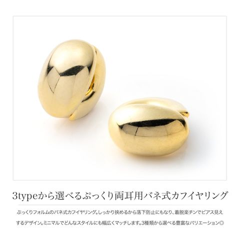 ぷっくりフォルムのバネ式カフイヤリング。しっかり挟めるから落下防止にもなり、着脱楽チンでピアス見えするデザイン。ミニマルでどんなスタイルにも幅広くマッチします。3種類から選べる豊富なバリエーション◎