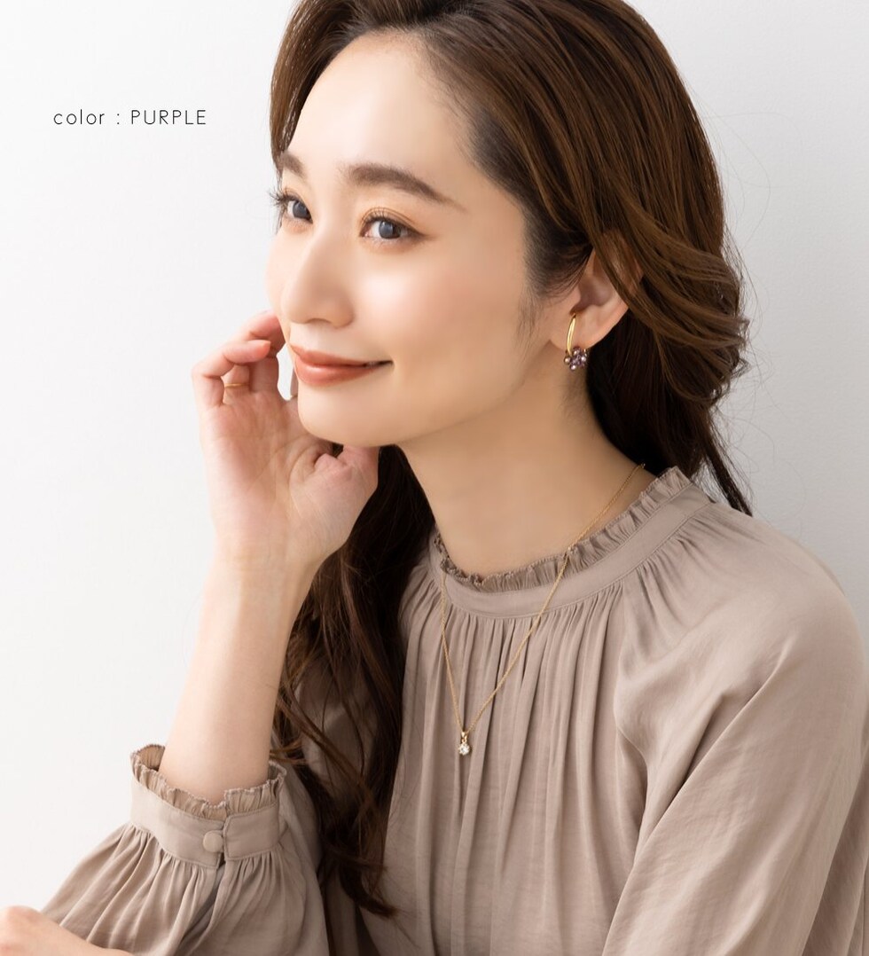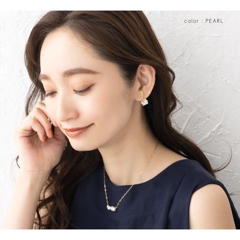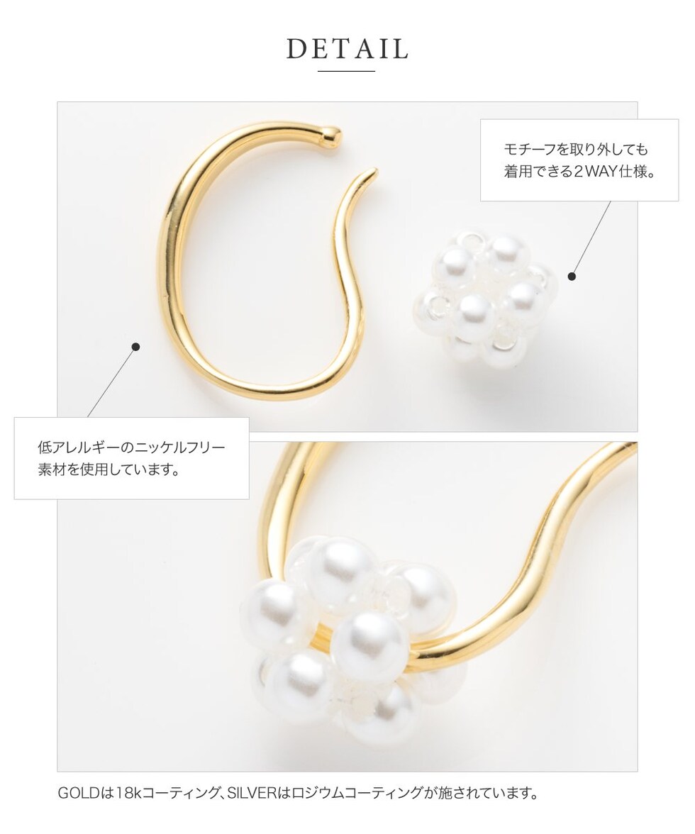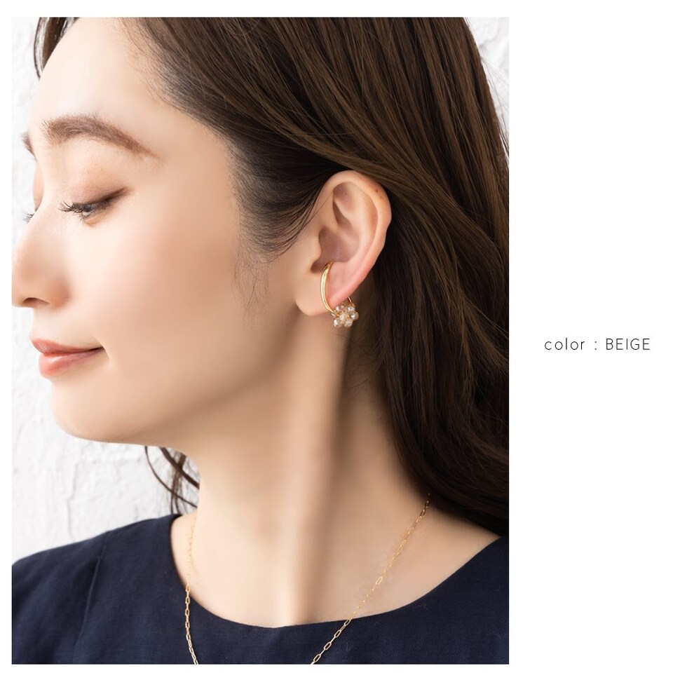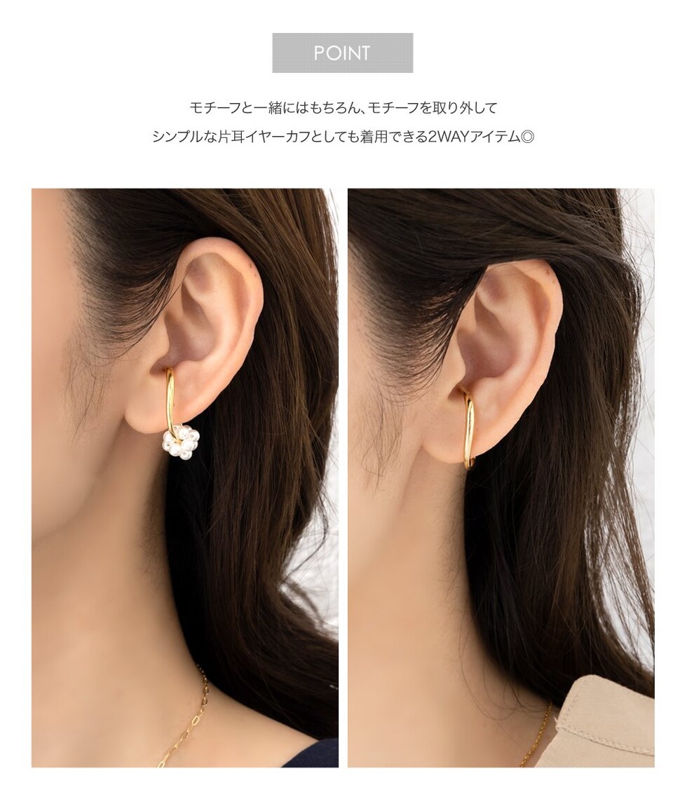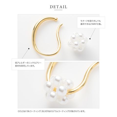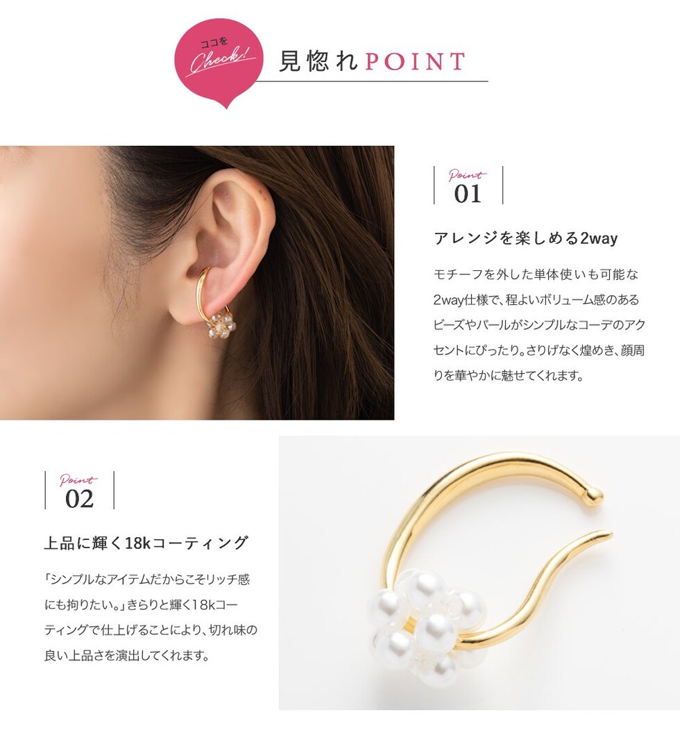 モチーフを外した単体使いも可能な2way仕様で、程よいボリューム感のあるビーズやパールがシンプルなコーデのアクセントにぴったり。さりげなく煌めき、顔周りを華やかに魅せてくれます。