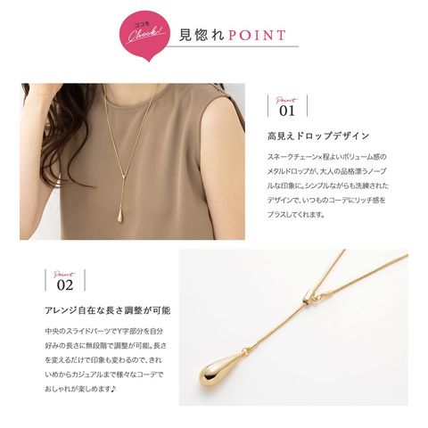 艶orヴィンテージから選べる、メタルドロップモチーフのY字ネックレス。Y字の部分はフリーアジャスターでお好みのバランスに調節可能◎トレンドのスネークチェーンでスタイリングのアクセントに活躍します。