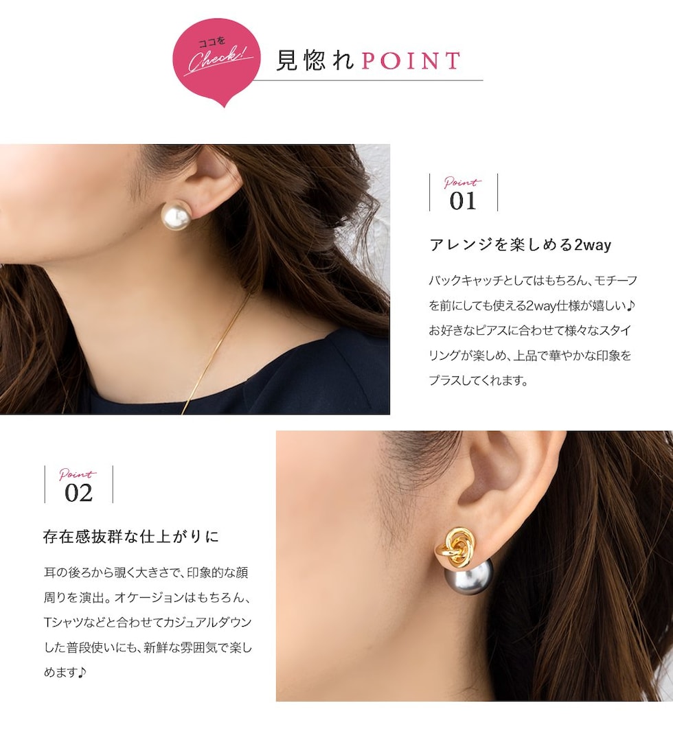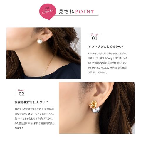 バックキャッチとしてはもちろん、モチーフを前にしても使える2way仕様が嬉しい♪お好きなピアスに合わせて様々なスタイリングが楽しめ、上品で華やかな印象をプラスしてくれます。