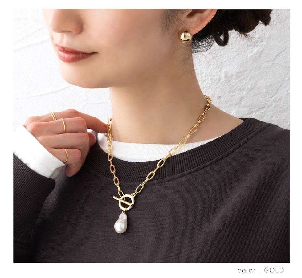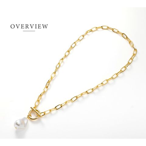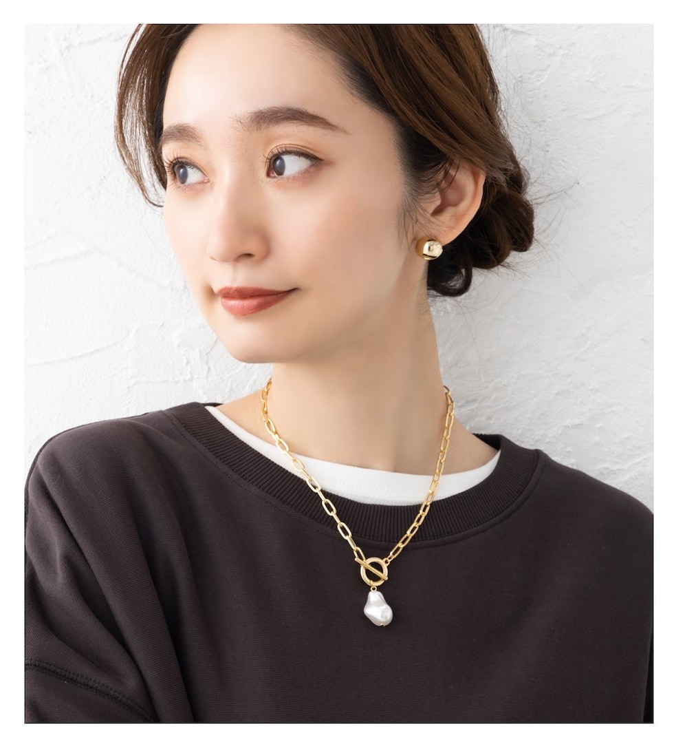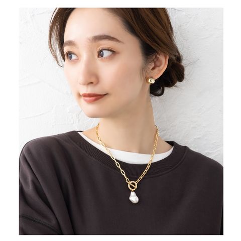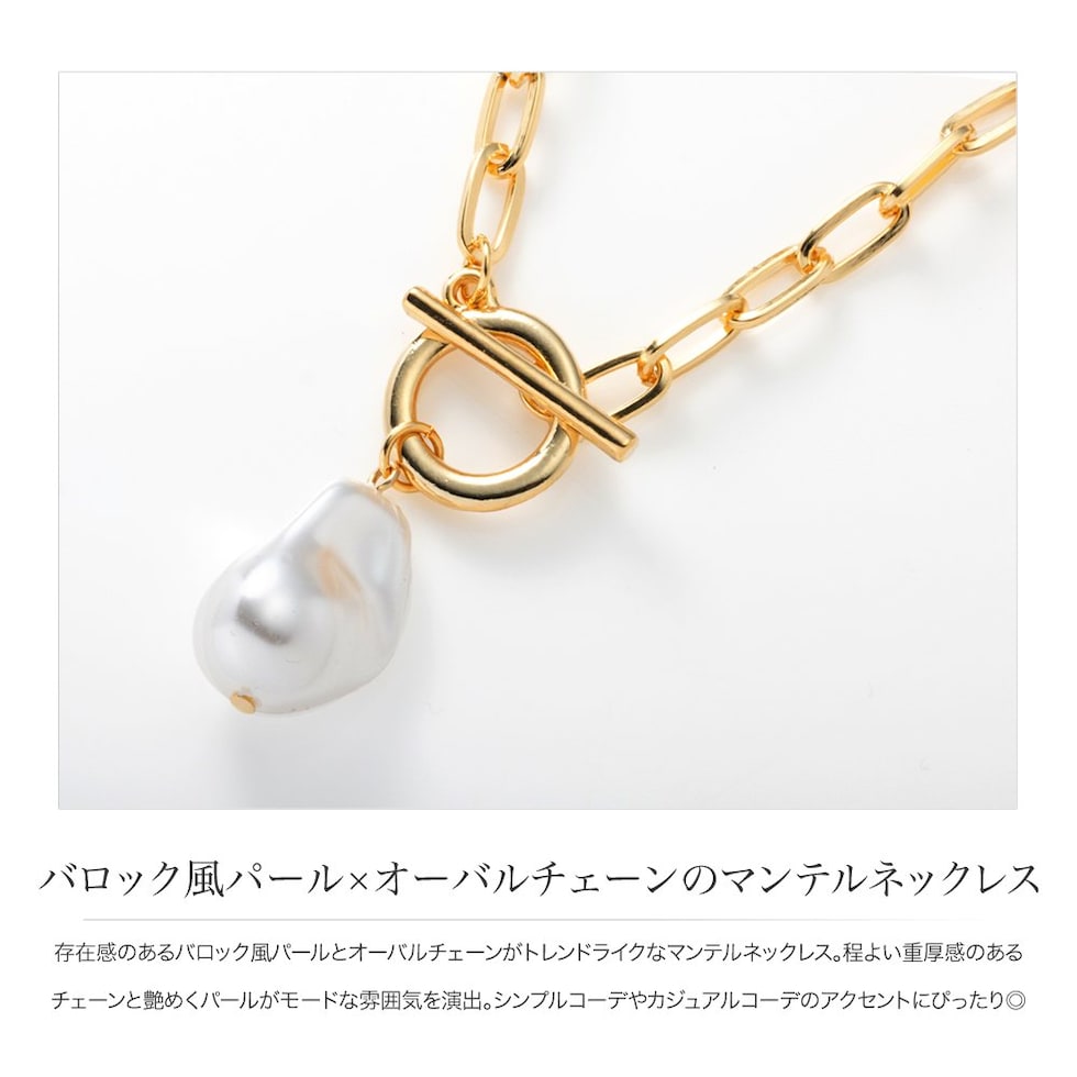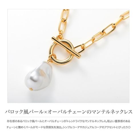 存在感のあるバロック風パールとオーバルチェーンがトレンドライクなマンテルネックレス。程よい重厚感のあるチェーンと艶めくパールがモードな雰囲気を演出。シンプルコーデやカジュアルコーデのアクセントにぴったり◎