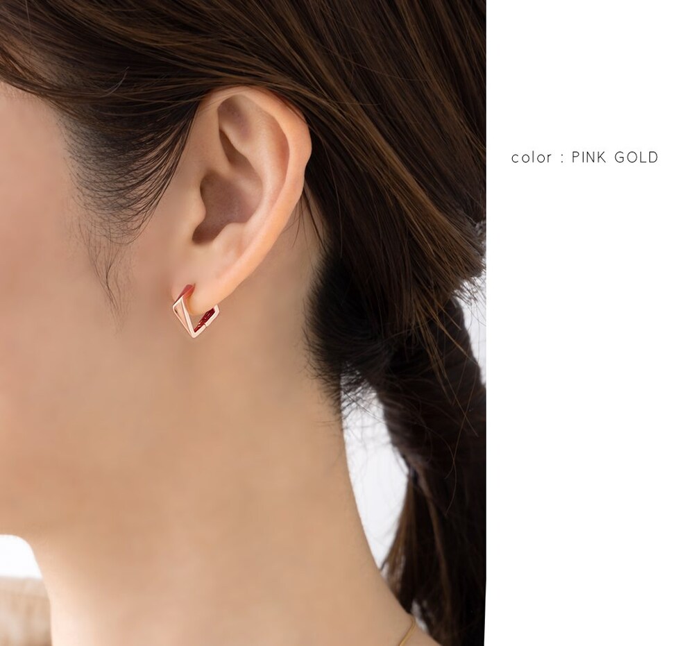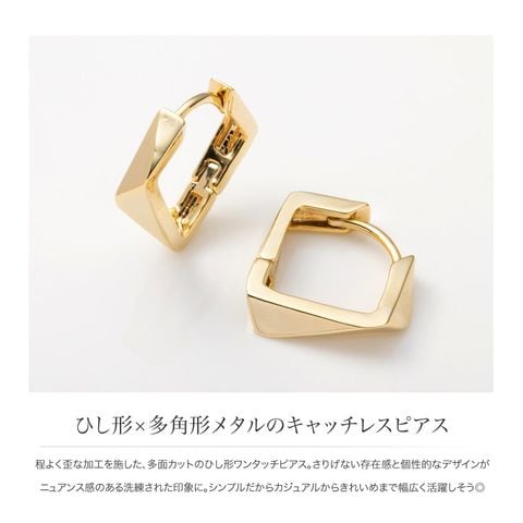 程よく歪な加工を施した、多面カットのひし形ワンタッチピアス。さりげない存在感と個性的なデザインがニュアンス感のある洗練された印象に。シンプルだからカジュアルからきれいめまで幅広く活躍しそう◎