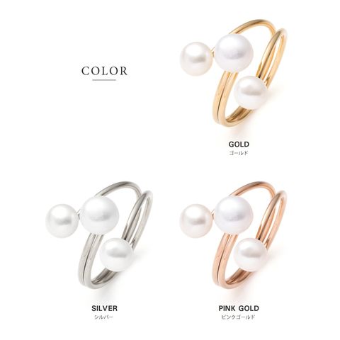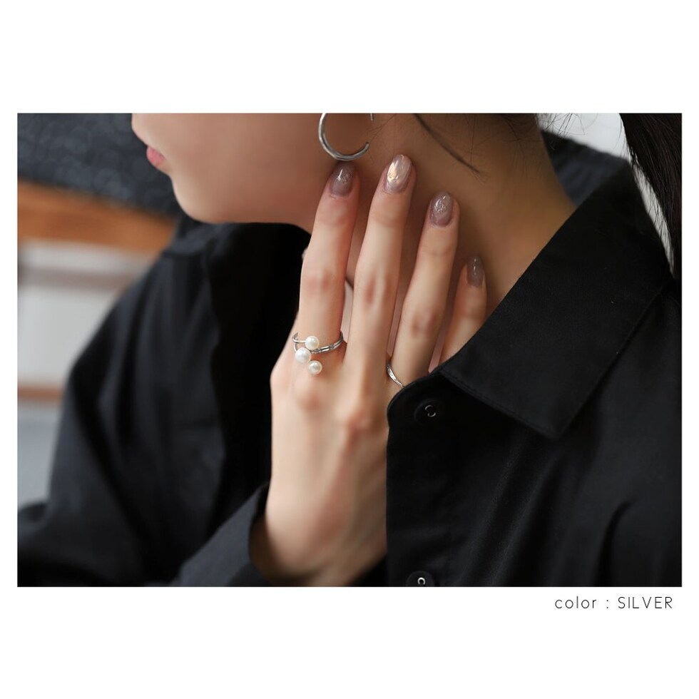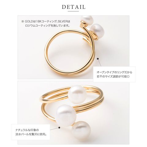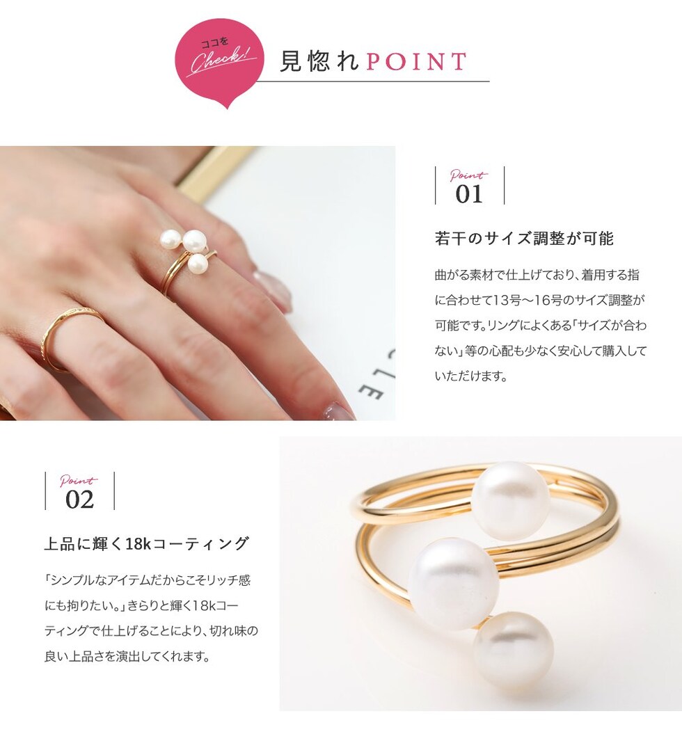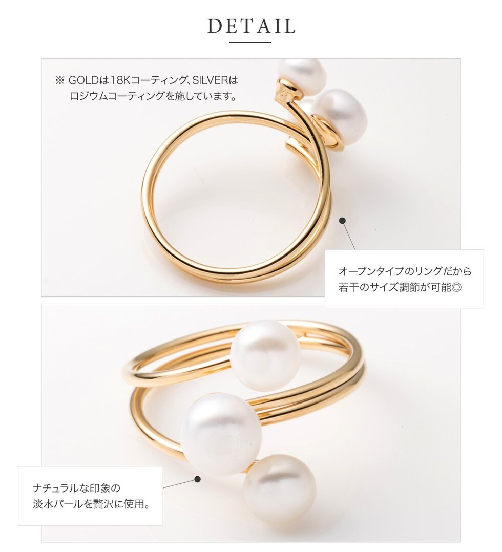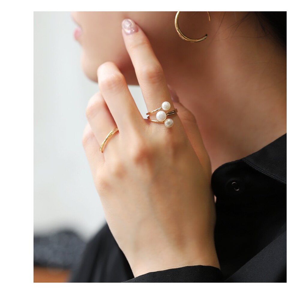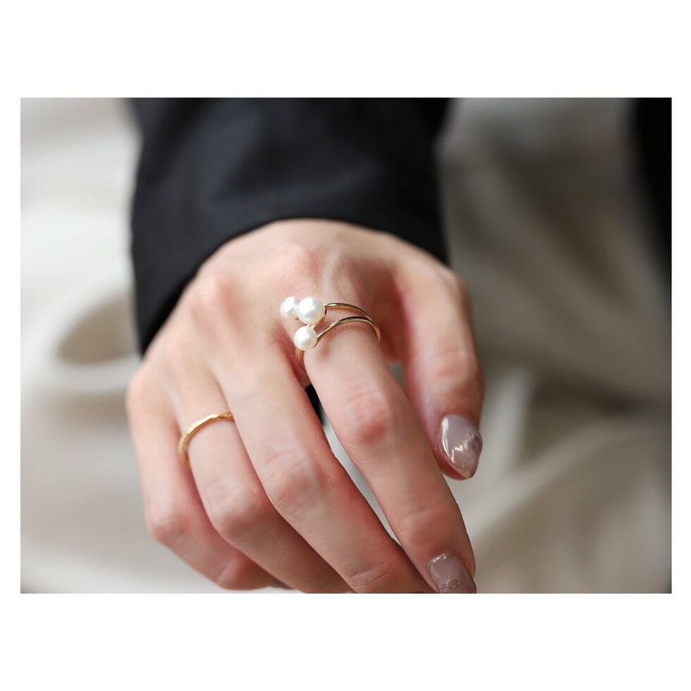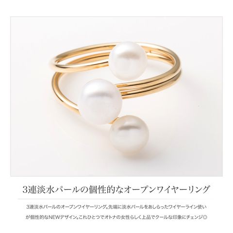3連淡水パールのオープンワイヤーリング。先端に淡水パールをあしらったワイヤーライン使いが個性的なNEWデザイン。これひとつでオトナの女性らしく上品でクールな印象にチェンジ◎