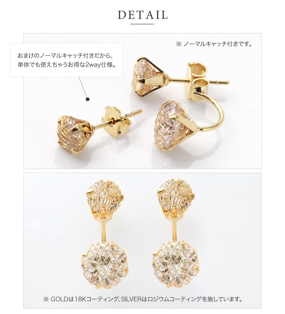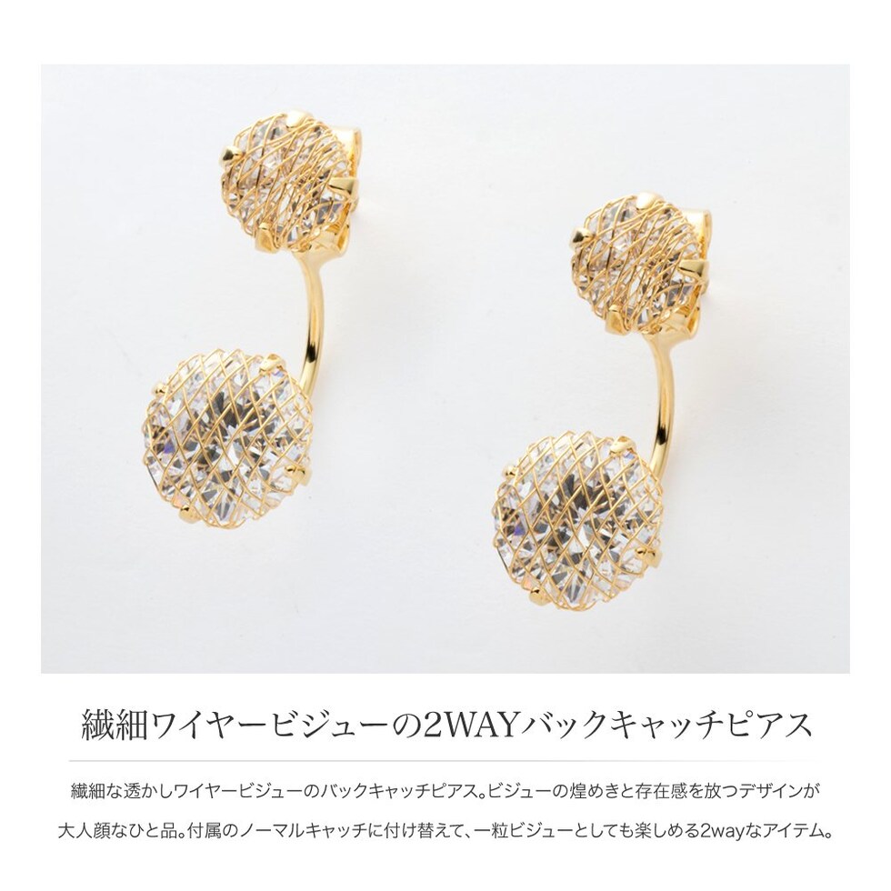繊細な透かしワイヤービジューのバックキャッチピアス。ビジューの煌めきと存在感を放つデザインが大人顔なひと品。付属のノーマルキャッチに付け替えて、一粒ビジューとしても楽しめる2wayなアイテム。