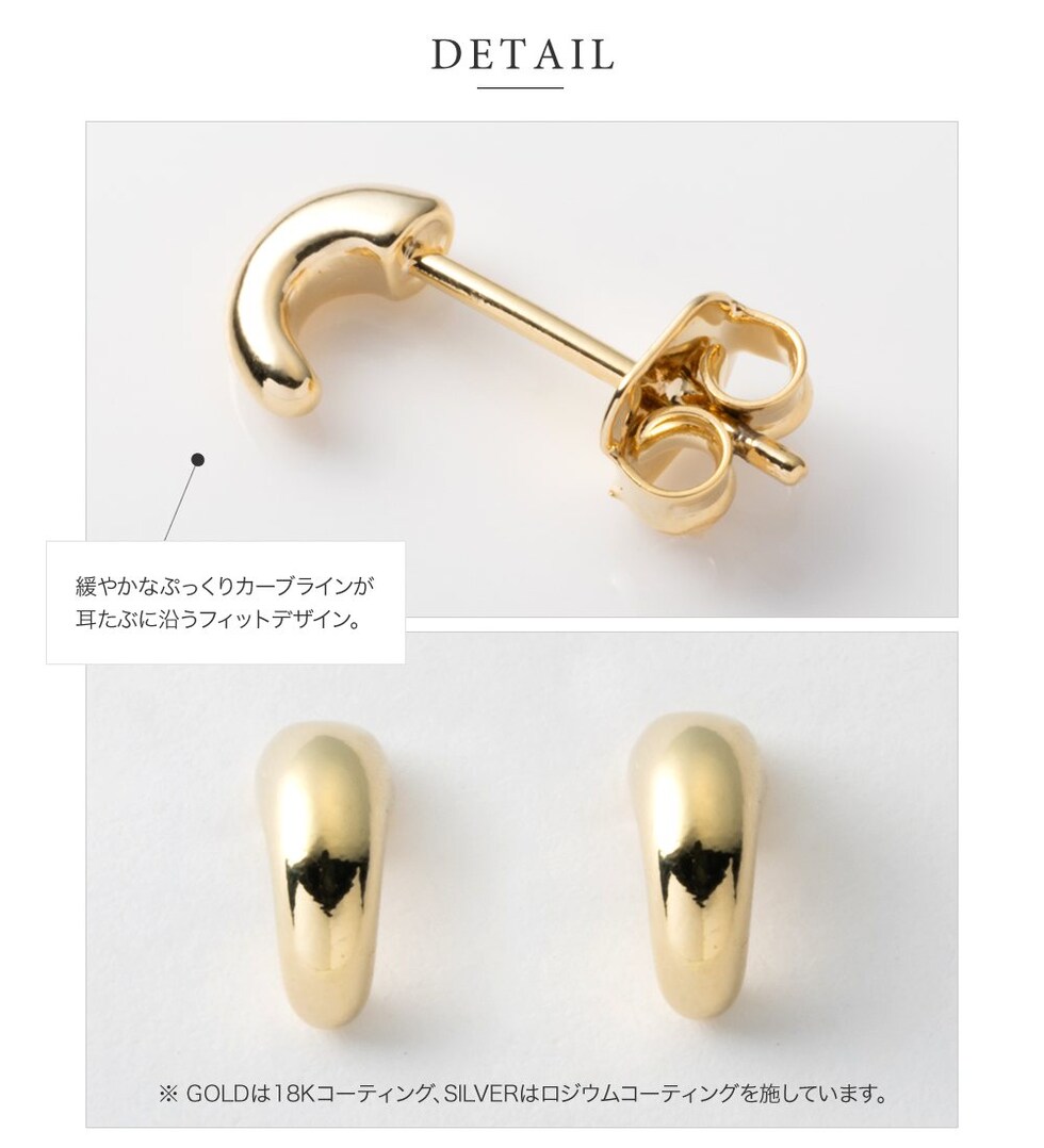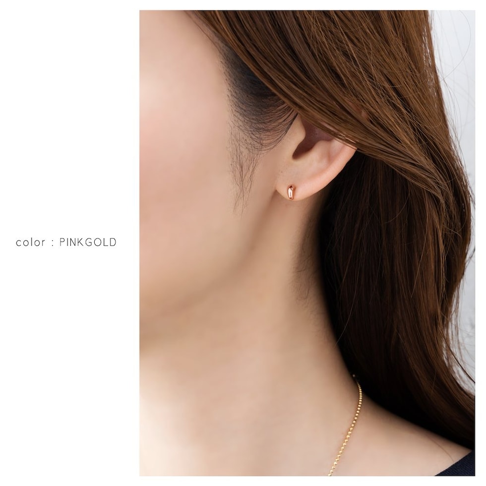 メタルドロップのミニマムフィットピアス。下に向かってシェイプするぷっくりメタルが耳たぶに沿うフィットデザイン。とっても華奢なサイジングが大人コーデのワンポイント使いに◎