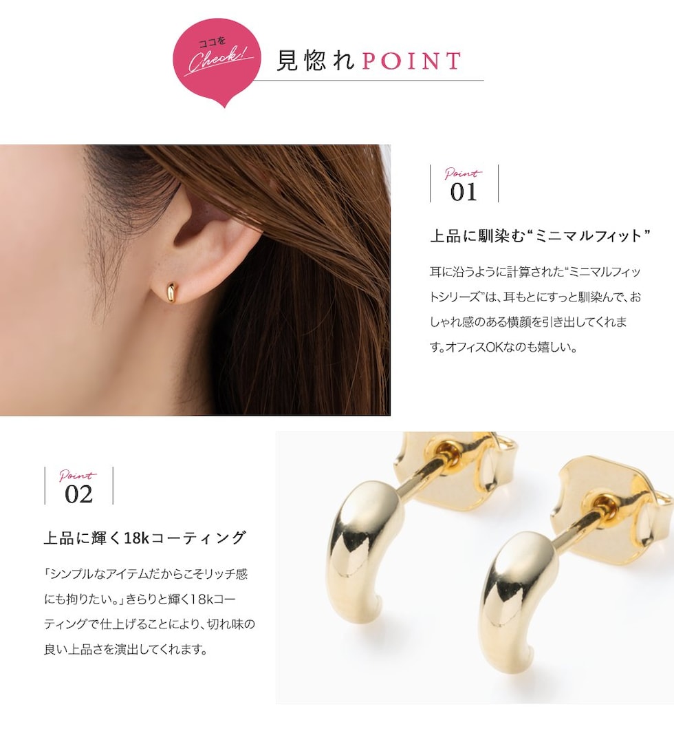 耳に沿うように計算された“ミニマルフィットシリーズ”は、耳もとにすっと馴染んで、おしゃれ感のある横顔を引き出してくれます。オフィスOKなのも嬉しい。