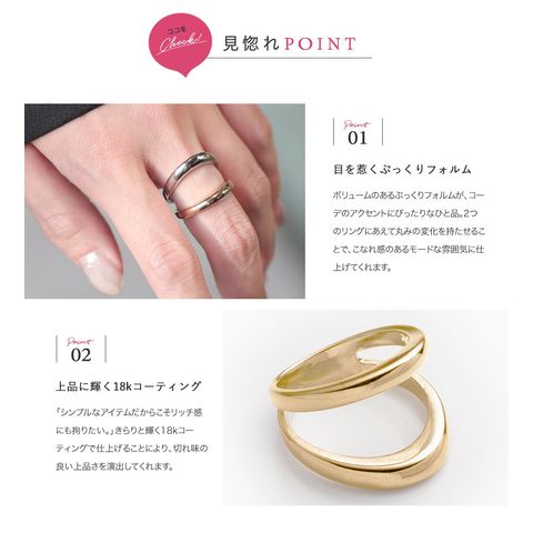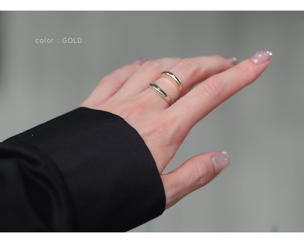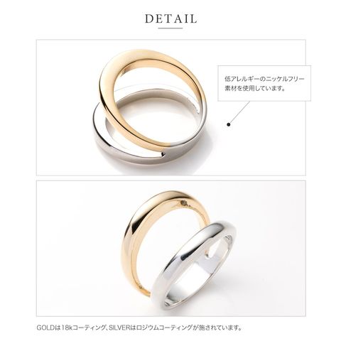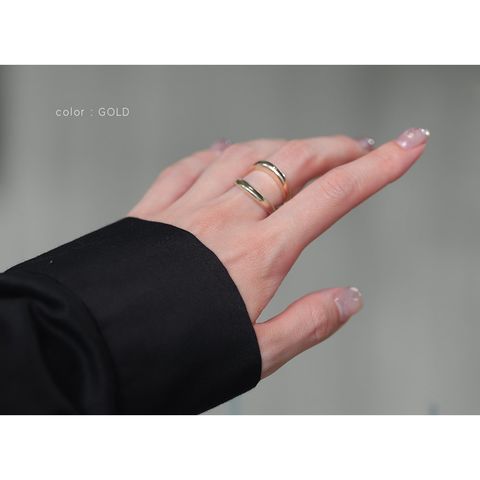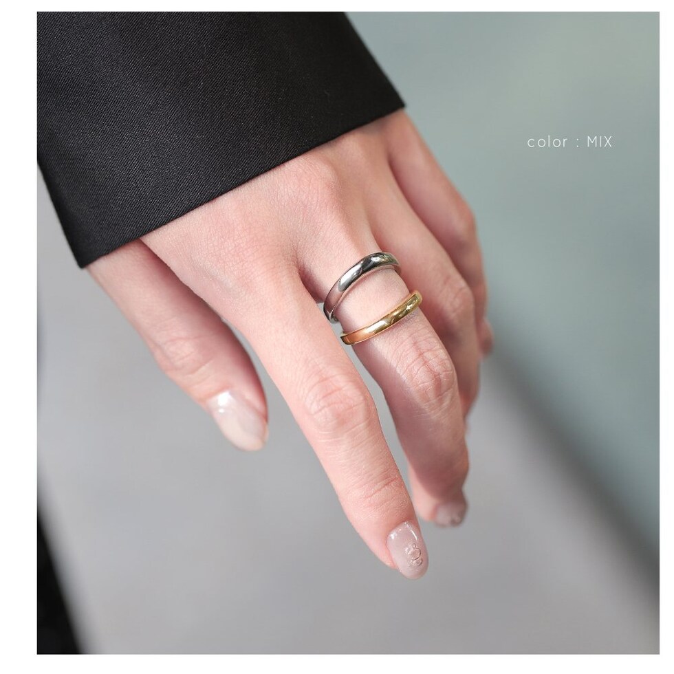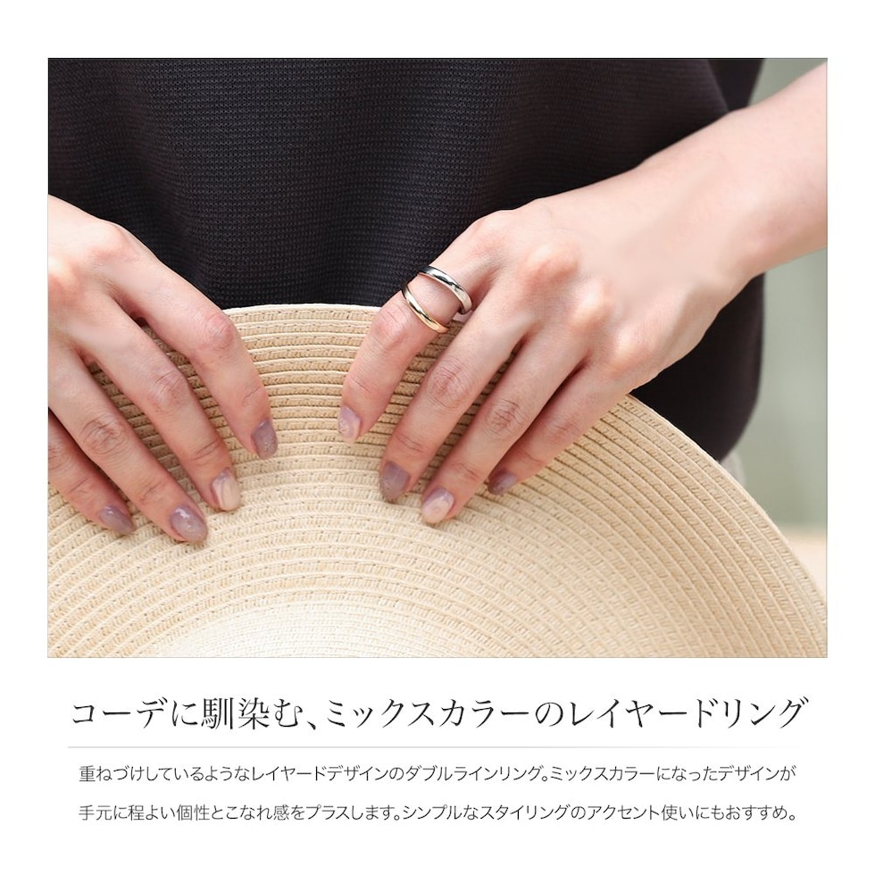 重ねづけしているようなレイヤードデザインのダブルラインリング。ミックスカラーになったデザインが手元に程よい個性とこなれ感をプラスします。シンプルなスタイリングのアクセント使いにもおすすめ。