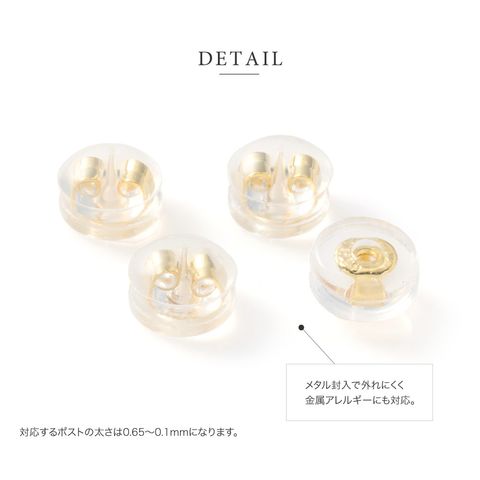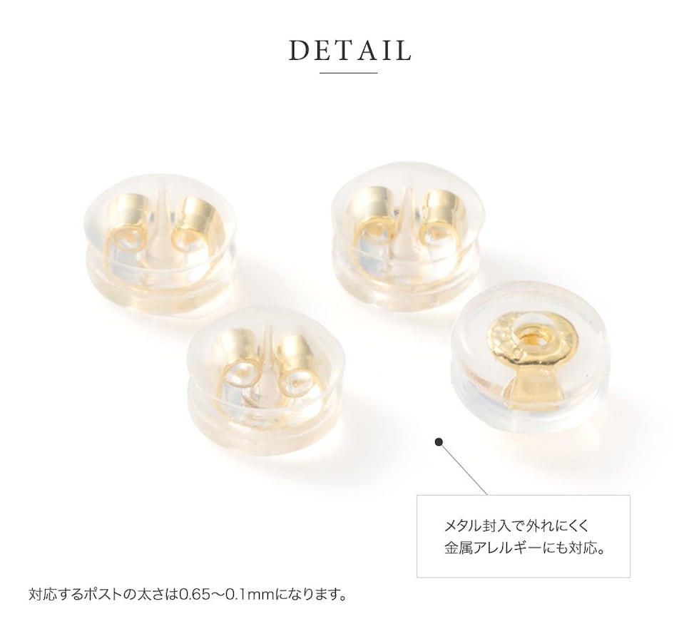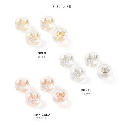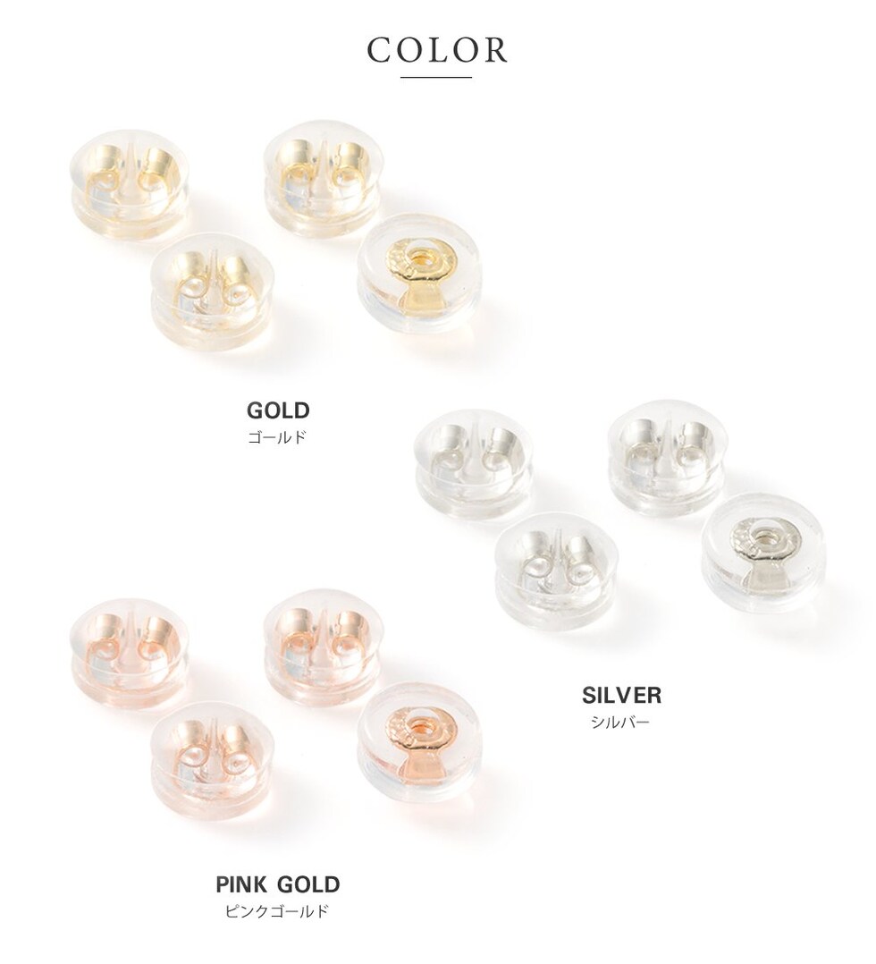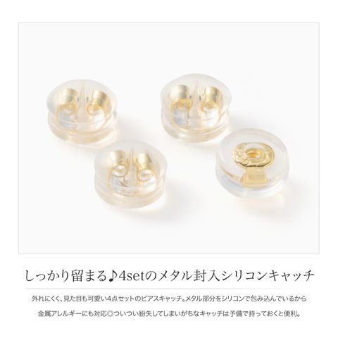 外れにくく、見た目も可愛い4点セットのピアスキャッチ。メタル部分をシリコンで包み込んでいるから金属アレルギーにも対応◎ついつい紛失してしまいがちなキャッチは予備で持っておくと便利。